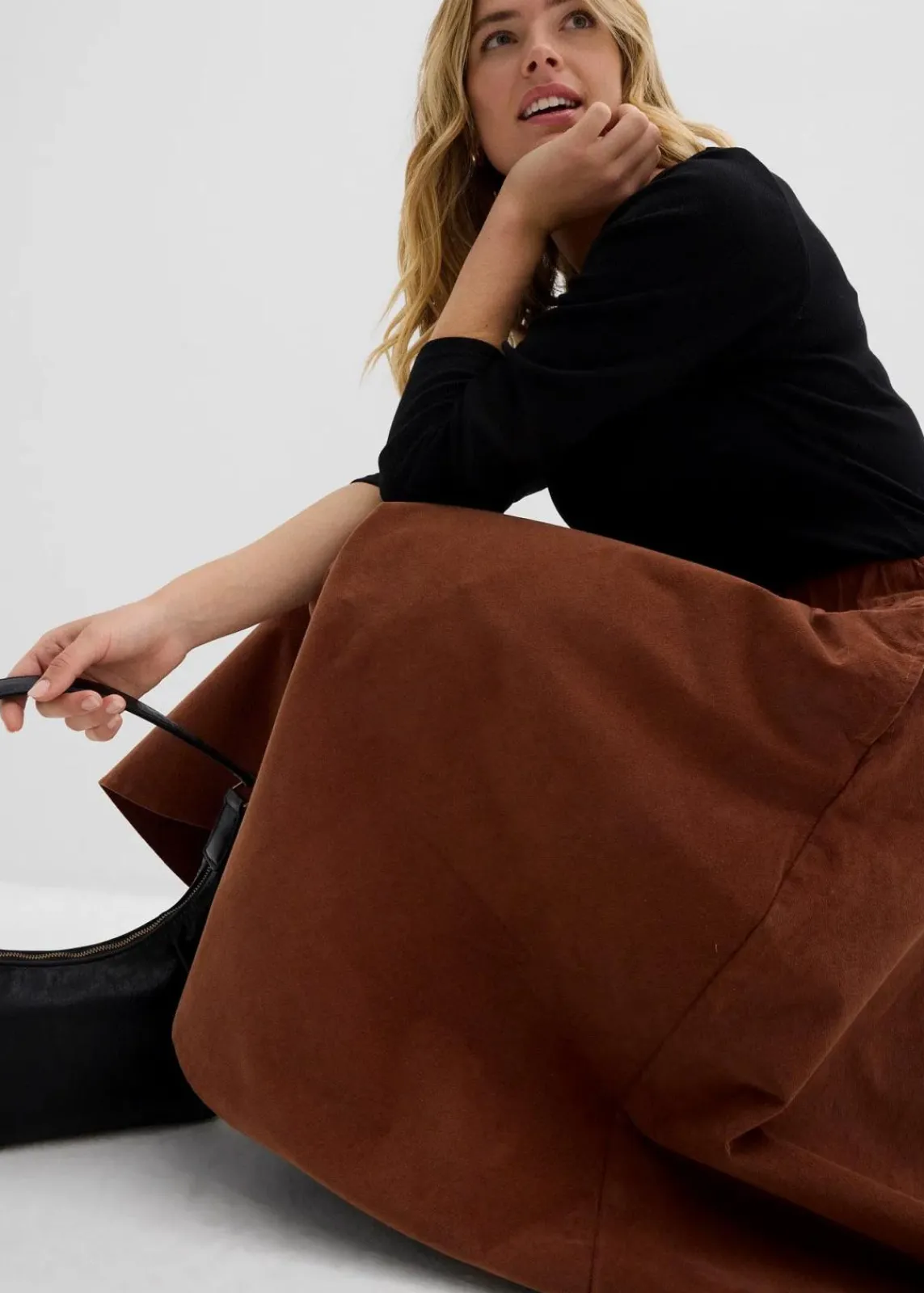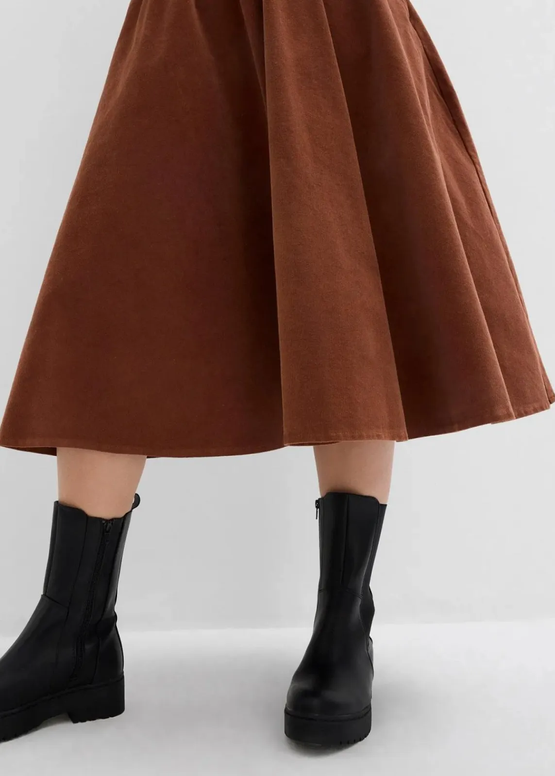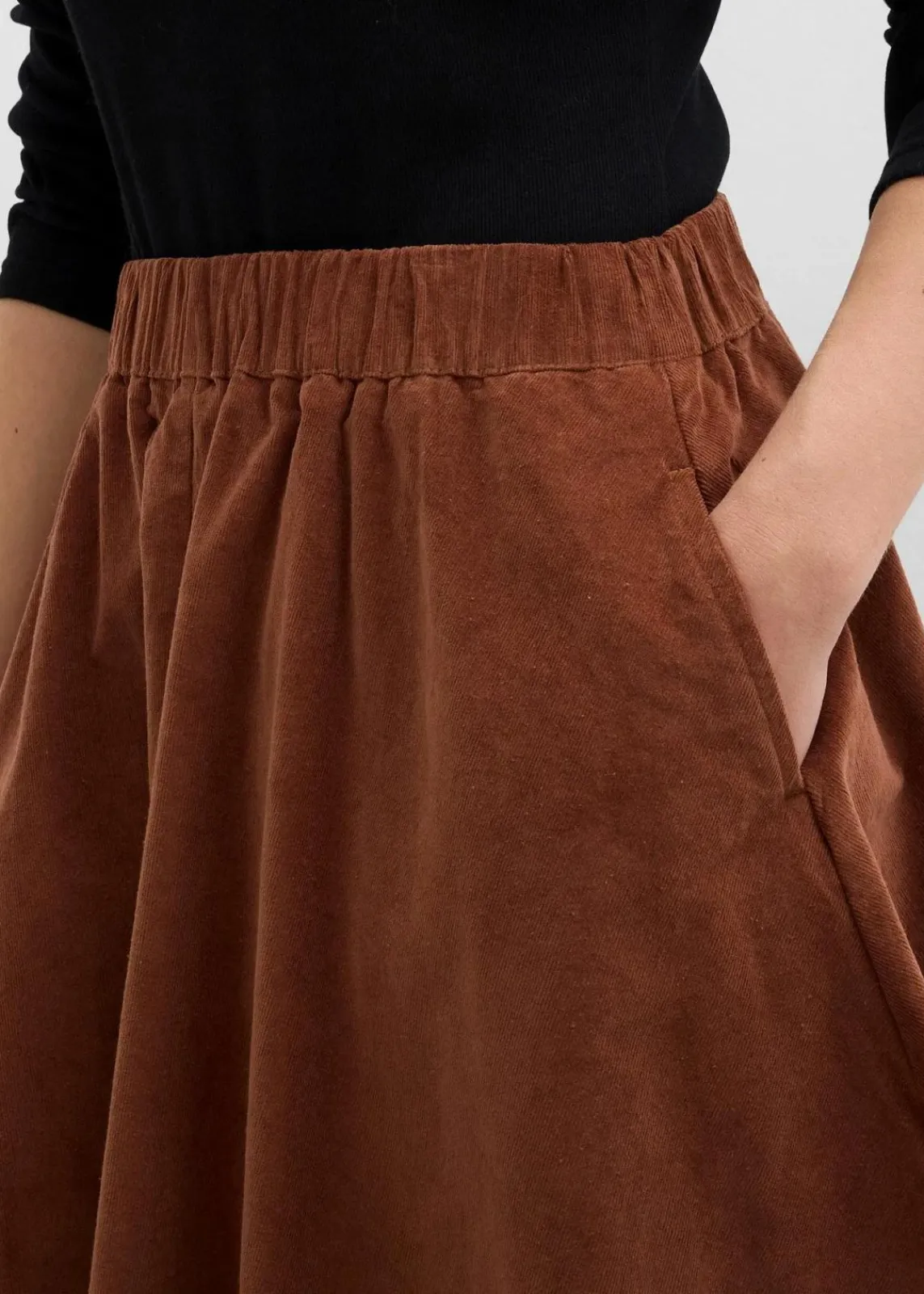 Cordrock mit elastischem Bund und seitlichen Eingriffstaschen.