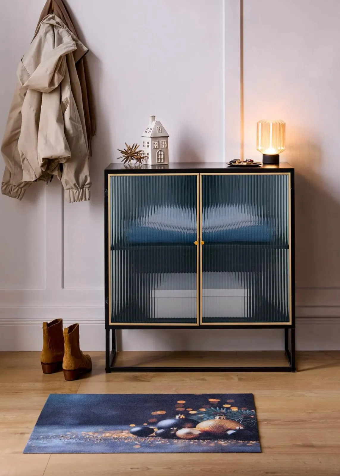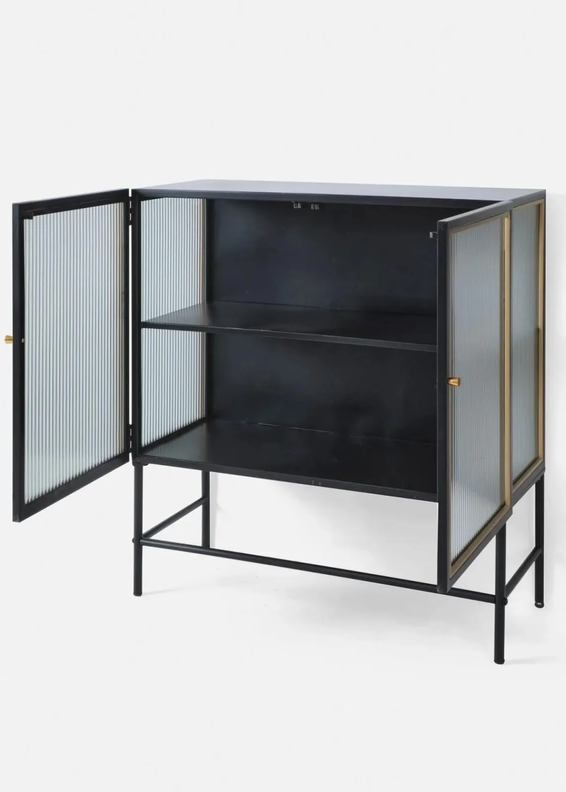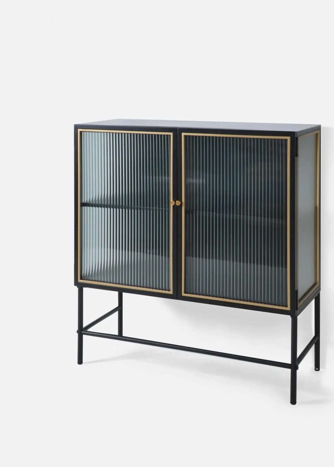 Dieser elegante Schrank verbindet modernes Design mit einem Hauch von Vintage-Charme. Die schwarze Oberfläche und die gerippten Glastüren verleihen ihm eine raffinierte Ausstrahlung, während die goldenen Akzente für einen Hauch von Luxus sorgen. Mit ausreichend Stauraum im Inneren ist er ideal für die Aufbewahrung von Geschirr, Büchern oder Dekorationsgegenständen. Die klaren Linien und die stilvollen Details machen diesen Schrank zu einem Blickfang in jedem Raum. Setze deine Lieblingsstücke gekonnt in Szene und genieße die zeitlose Eleganz, die dieser Schrank in dein Zuhause bringt.