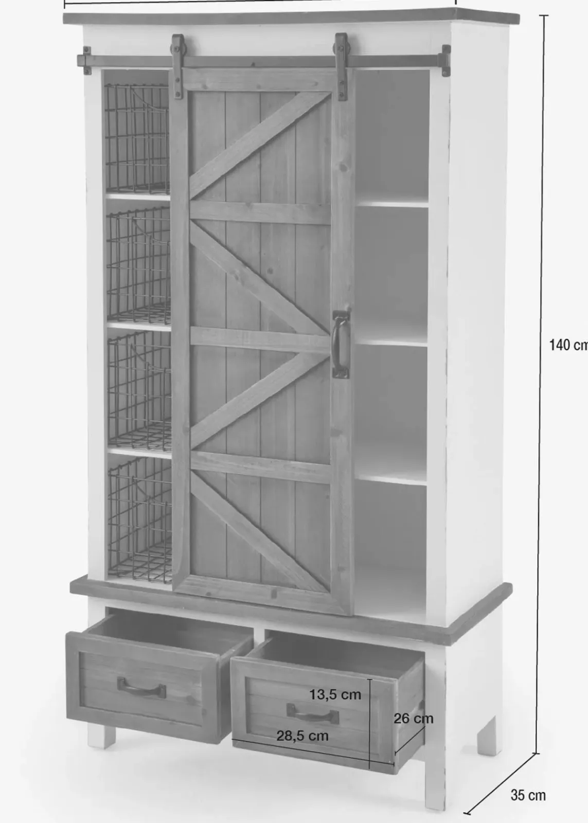 Wir präsentieren unser charmantes Landhausregal! Mit seiner rustikalen Optik und der praktischen Schiebetür ist es nicht nur ein Blickfang, sondern auch äußerst funktional. Die Kombination aus Holz und Metallgitter bietet vielseitigen Stauraum für Bücher, Dekoration oder Küchenutensilien. Die zwei Schubladen am Boden sorgen für zusätzlichen Platz und Ordnung. Bringe mit diesem Möbelstück ländlichen Charme in Dein Zuhause und schaffe eine gemütliche Atmosphäre!