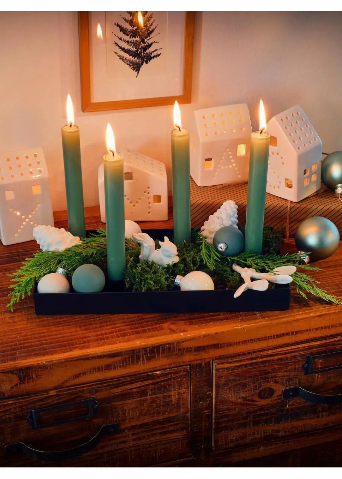Ausgefallener Kerzenhalter für 4 Kerzen. Die Kerzenhalter sind magnetisch und individuell auf dem Tablett aufstellbar. Zwischen den Kerzen bleibt genügend Platz für eine schöne weihnachtliche Dekoration.