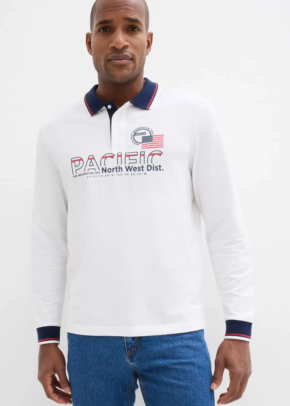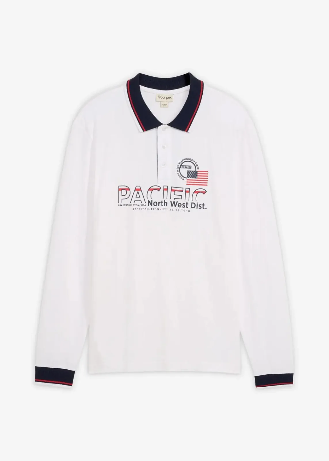 Klassisches Langarm-Poloshirt mit geradem Saum und coolen Kontraststreifen. Ein Druck ziert die Brust.