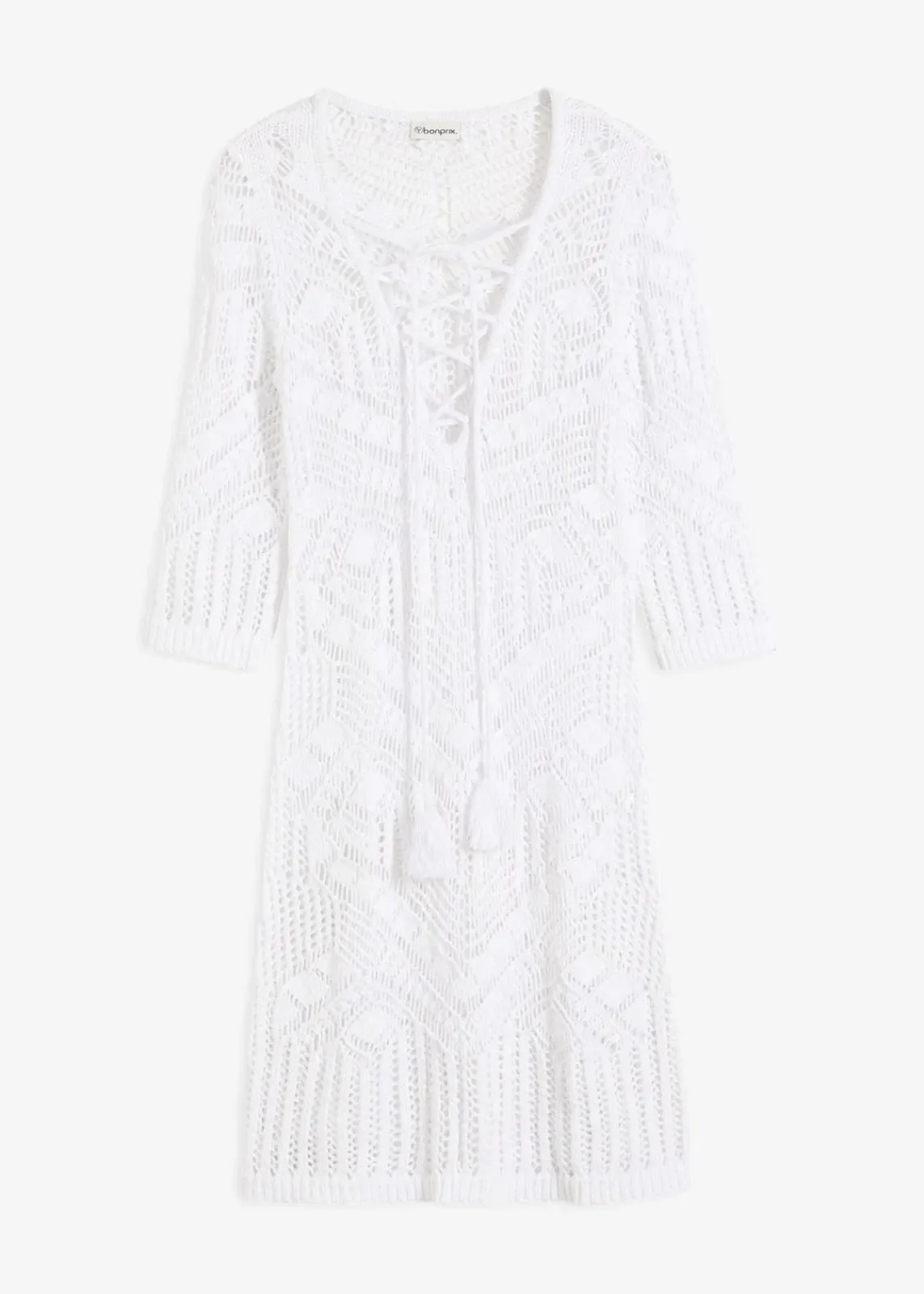 Luftiges Strickkleid aus Strick für den Strand. Mit Schnürung am Ausschnitt. Ärmel in 3/4-Länge.