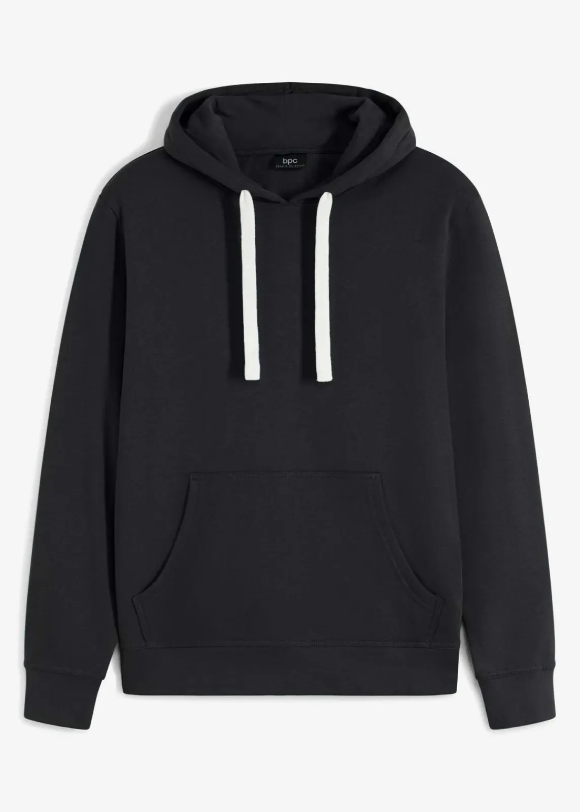 Modernes Basic Kapuzensweatshirt mit kontrastfarbenen Kordelzügen, innen weich angeraut. Mit gerippten Bündchen und aufgesetzter Tasche