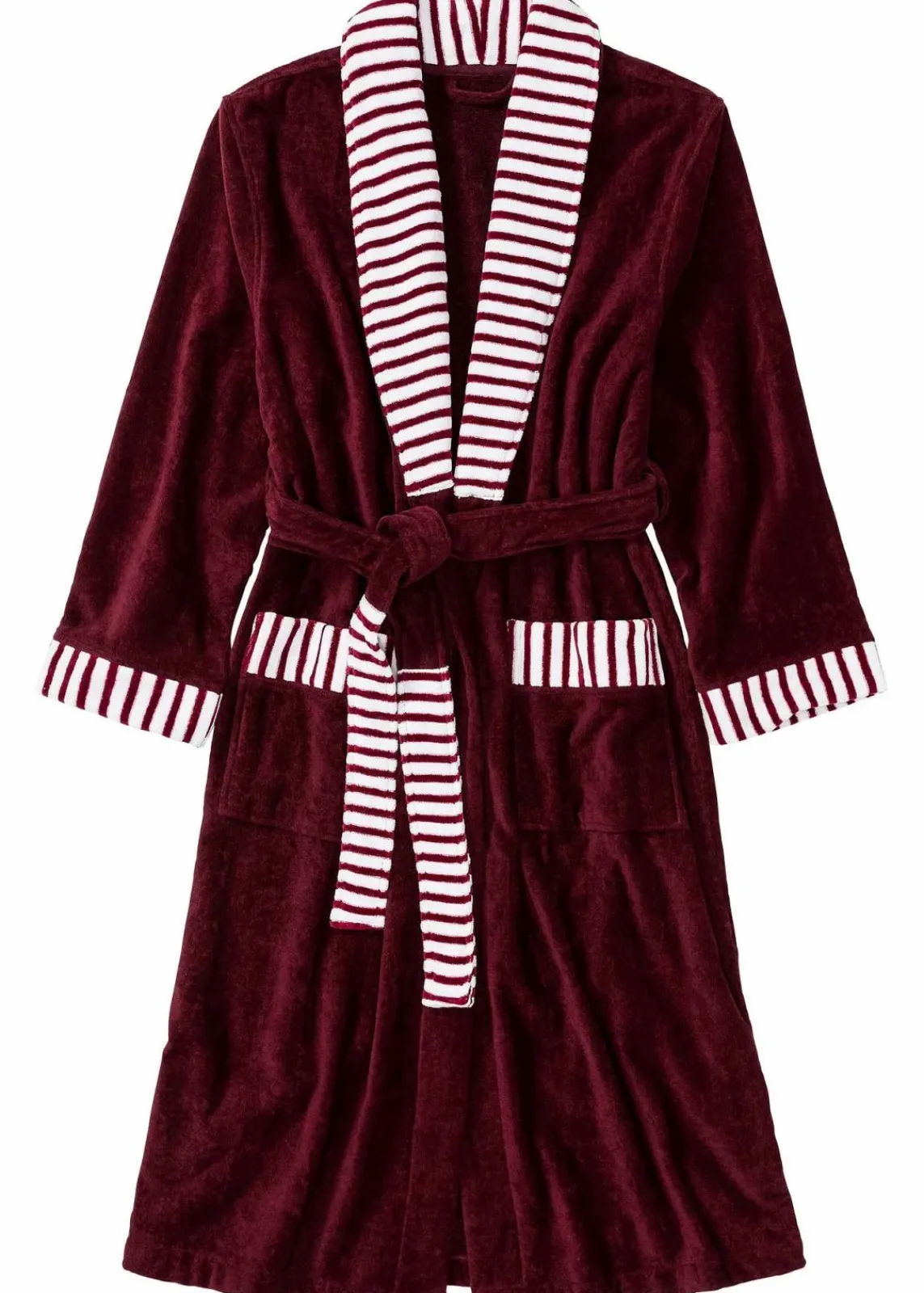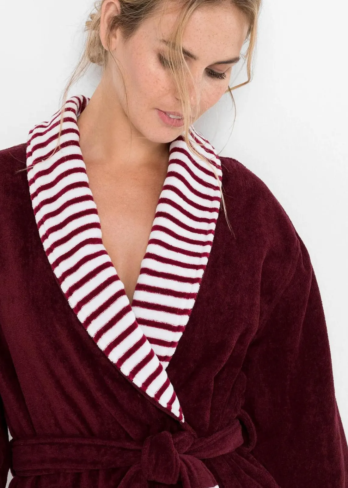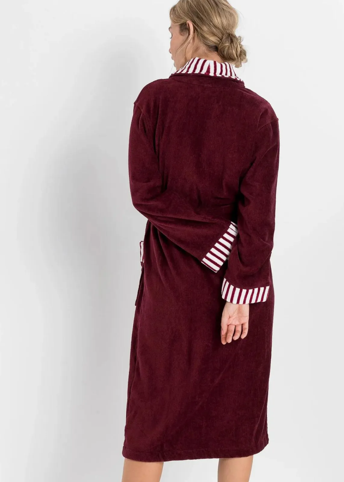 Dieser Frottee Bademantel ist im klassischen Schnitt mit Bindegürtel und aufgesetzten Taschen gestaltet. Optische Hingucker sind die farblichen Akzente am Schalkragen und Ärmelsämen, sowie als Dekoration auf den Taschen und am Bindeband. Der Bademantel ist aus flauschiger Baumwolle und sorgt somit auch für ein behagliches Tragegefühl.