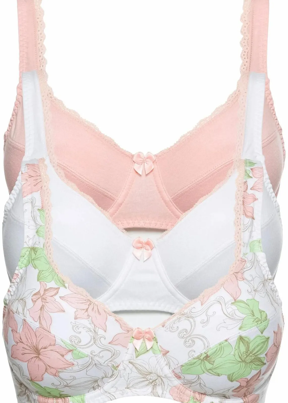 Der BH aus Baumwolle wird im 3er Pack geliefert. Der schöne Blumendruck wird von Spitze an den Cupkanten und einer Schleife am Steg ergänzt. Der eingearbeitete Bügel sorgt für optimalen Halt.