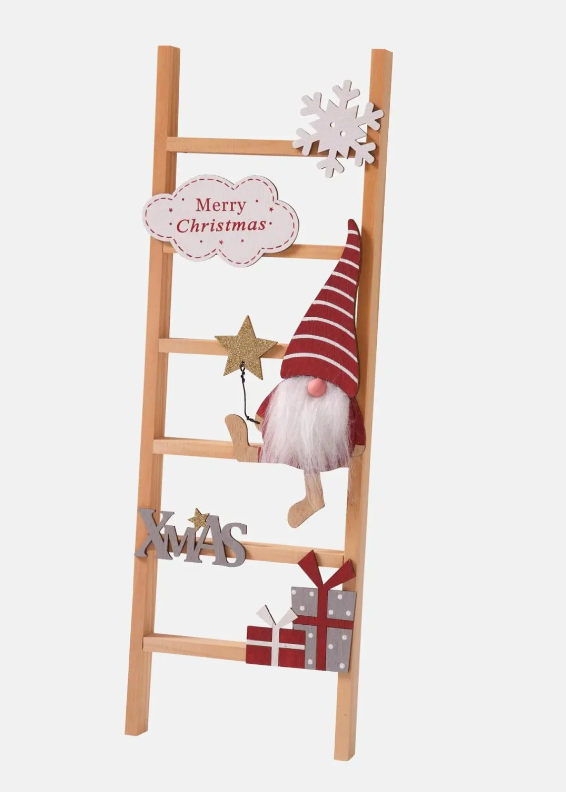 Niedliche Dekoration zum Anlehnen an der Wand – Leiter mit einem Wichtel und Geschenke und einem „Merry Christmas“ Gruß. Ein Hingucker in der Weihnachtszeit.