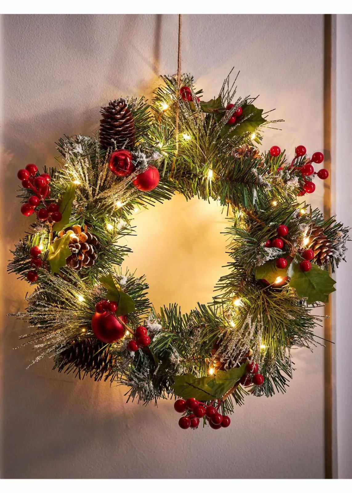 Dekorativer Türkranz, verziert mit Blättern, Früchten und 50 warm/weißen LED´s. Mit Timerfunktion. Eine wunderschöne Dekoration für die Tür oder auch an der Wand oder im Fenster.