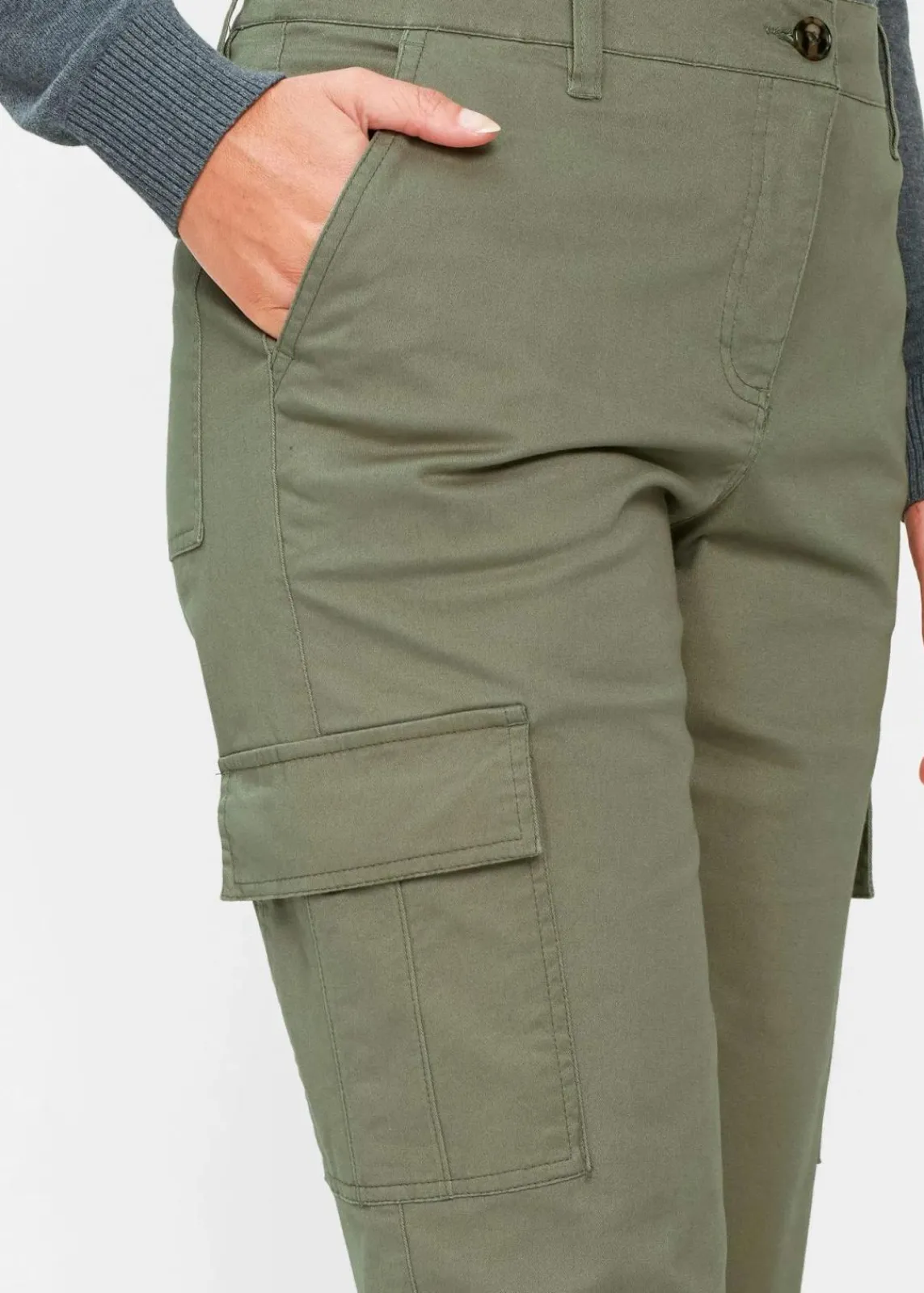 Diese lässige Cargo-Hose ist besonders bequem aufgrund des Anteils an Elasthan und des Bequembundes. Der lässige Schnitt der Hose trägt ebenso zur bequemlichkeit bei. Die moderne Cargo-Hose ist vielseitig zu kombinieren. Ein klassischer Rollkragenshirt, einem legeren Shirt oder einem modischen Print-Shirt von bpc Selection passen perfekt zu der schlichten Farbe der lässigen Cargo-Hose. Feminine Pumps oder flache Schuhe runden das Outfit mit zarten Schmuck und einer modischen Tasche ab.