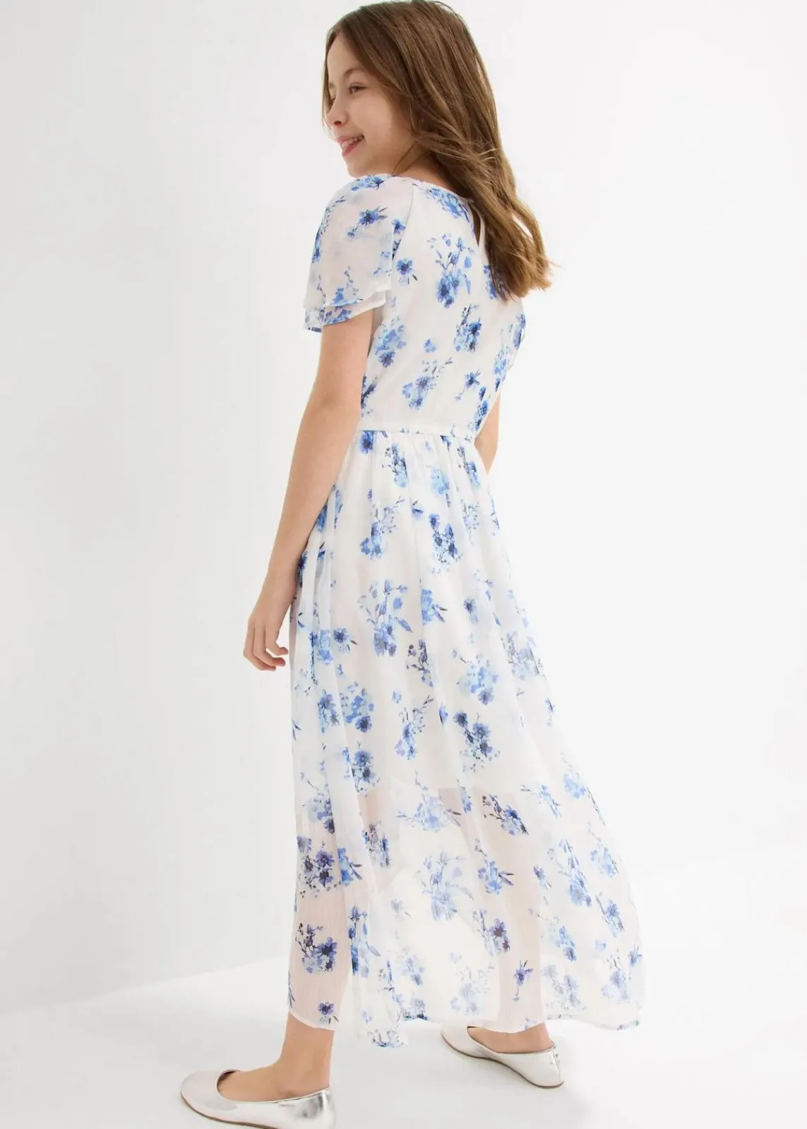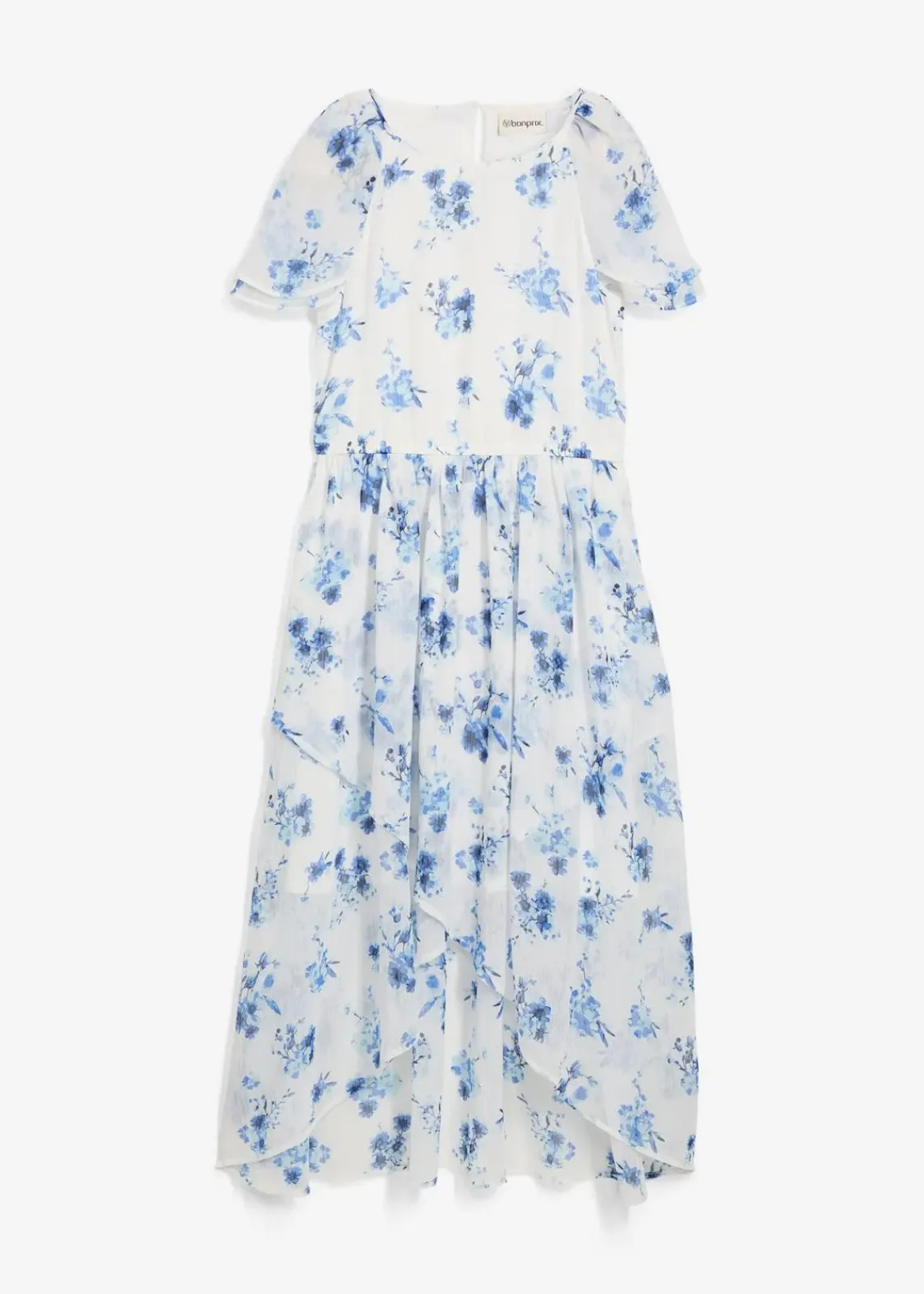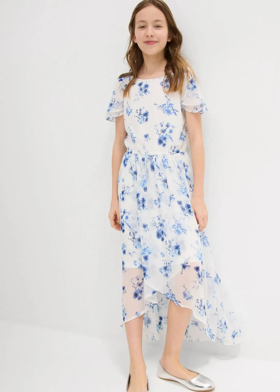 Sommerliches Chiffonkleid für Mädchen: Rundhalsausschnitt, Raglanärmel mit Volants, asymmetrischer Saum, elastische Taille – ein luftig-leichter Hingucker mit Allover-Print!