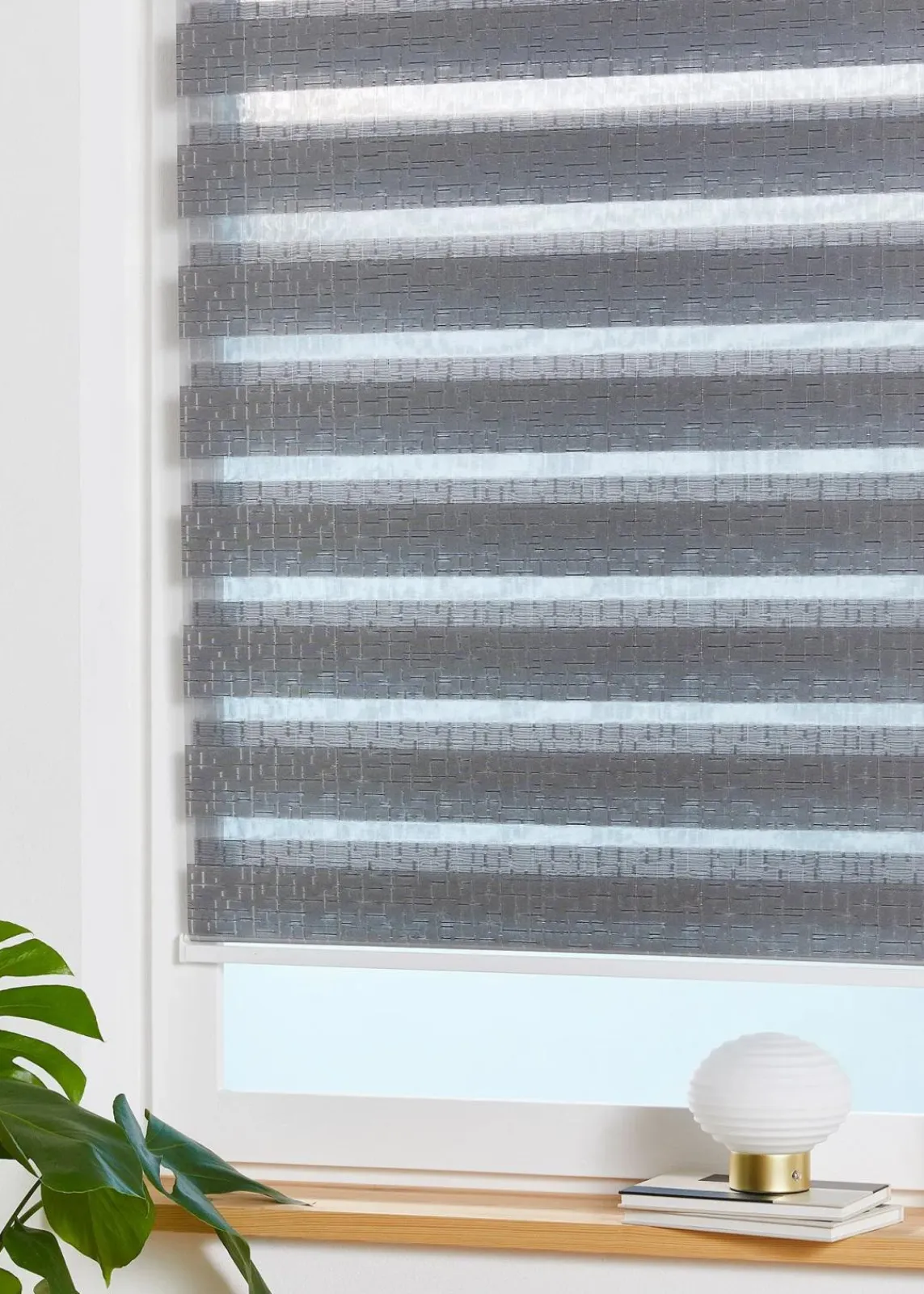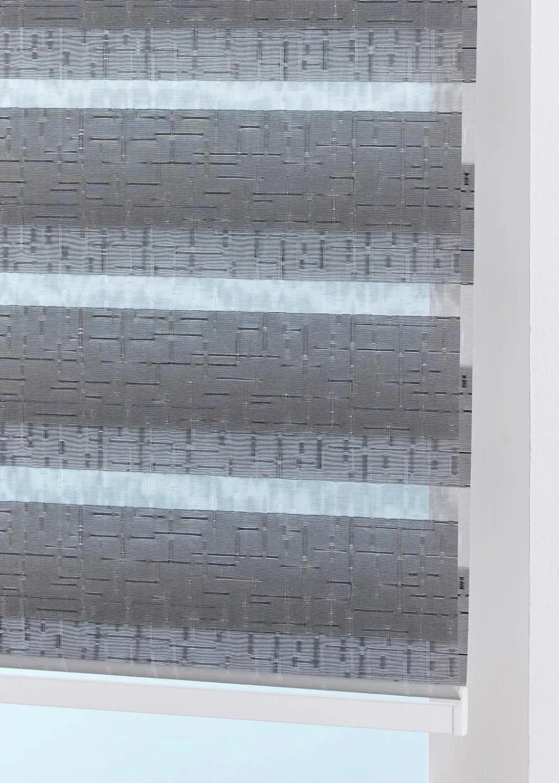 Das Doppelrollo in Jacquard Qualität ist eine moderne Fensterdekoration mit praktischem Effekt, denn es kann individuell eingestellt werden von Durchsicht, bis halbtransparent bis transparent.