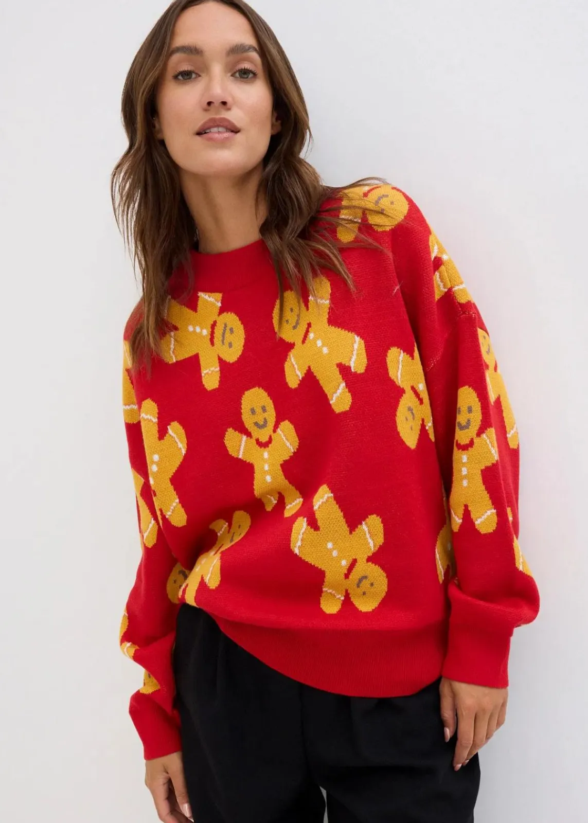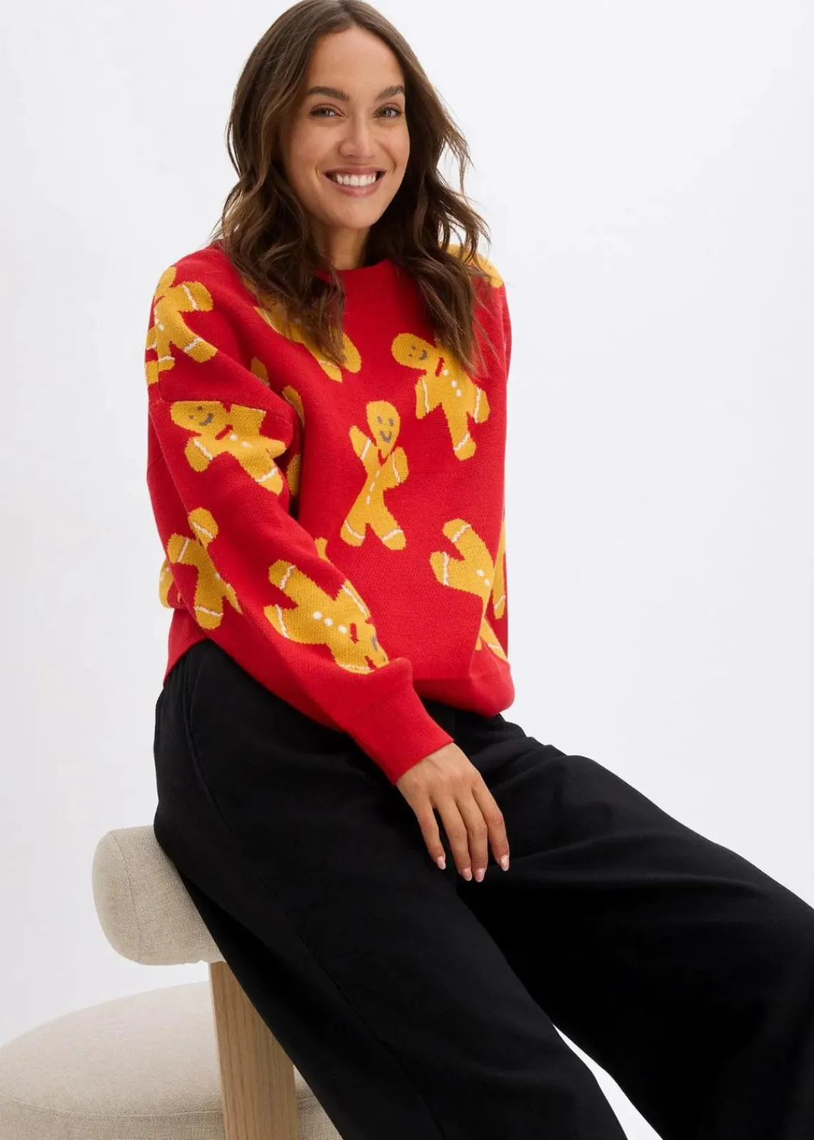 Weit geschnittener Rundhalspullover mit weihnachtlichem Motiv