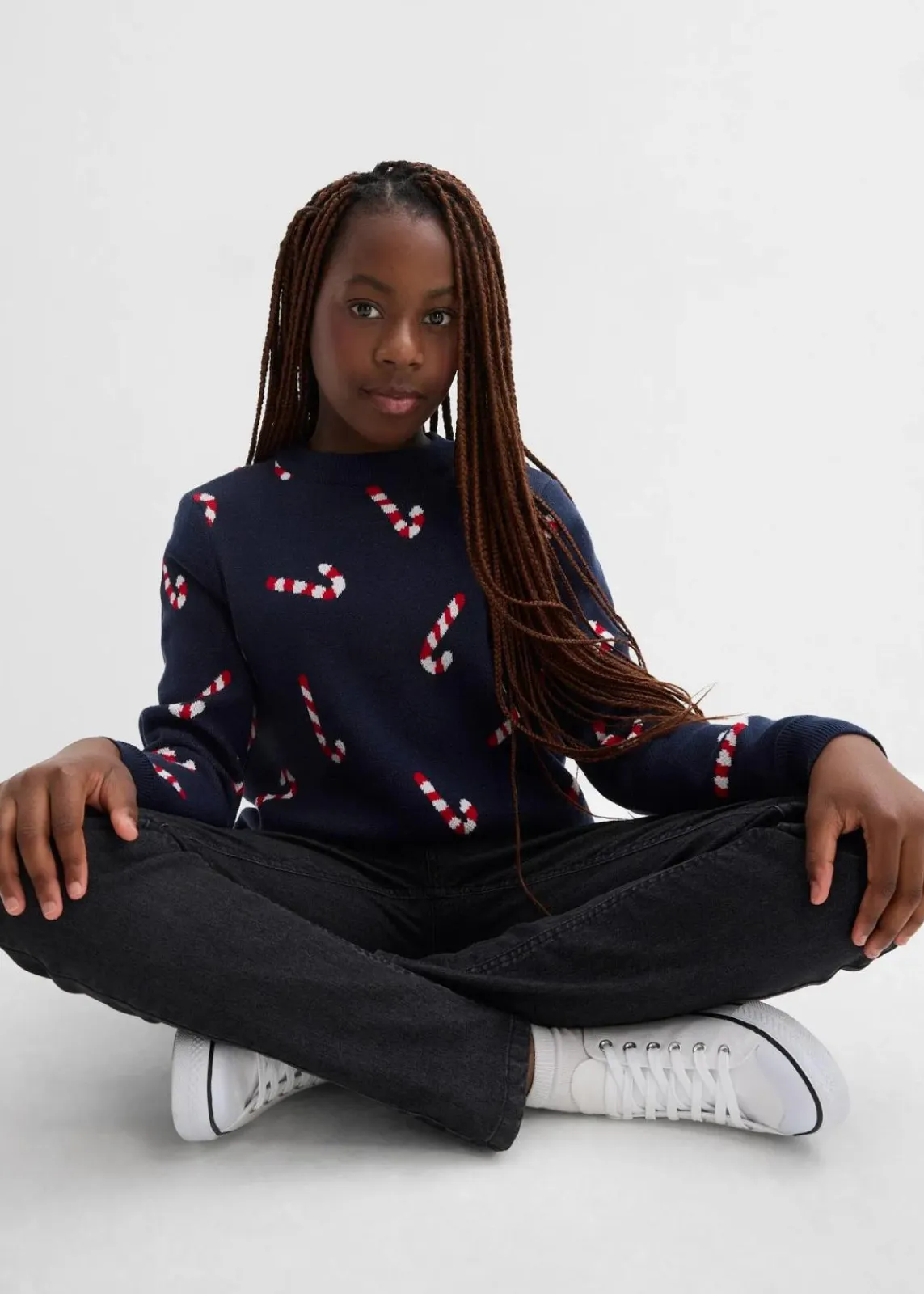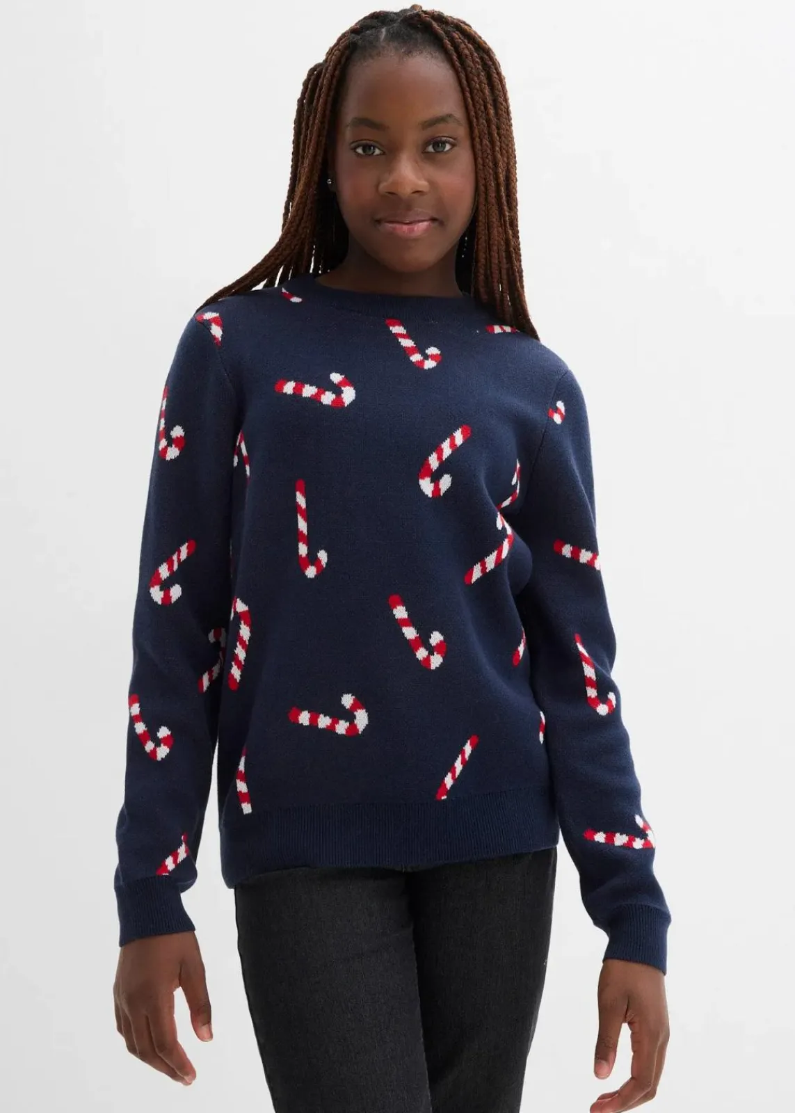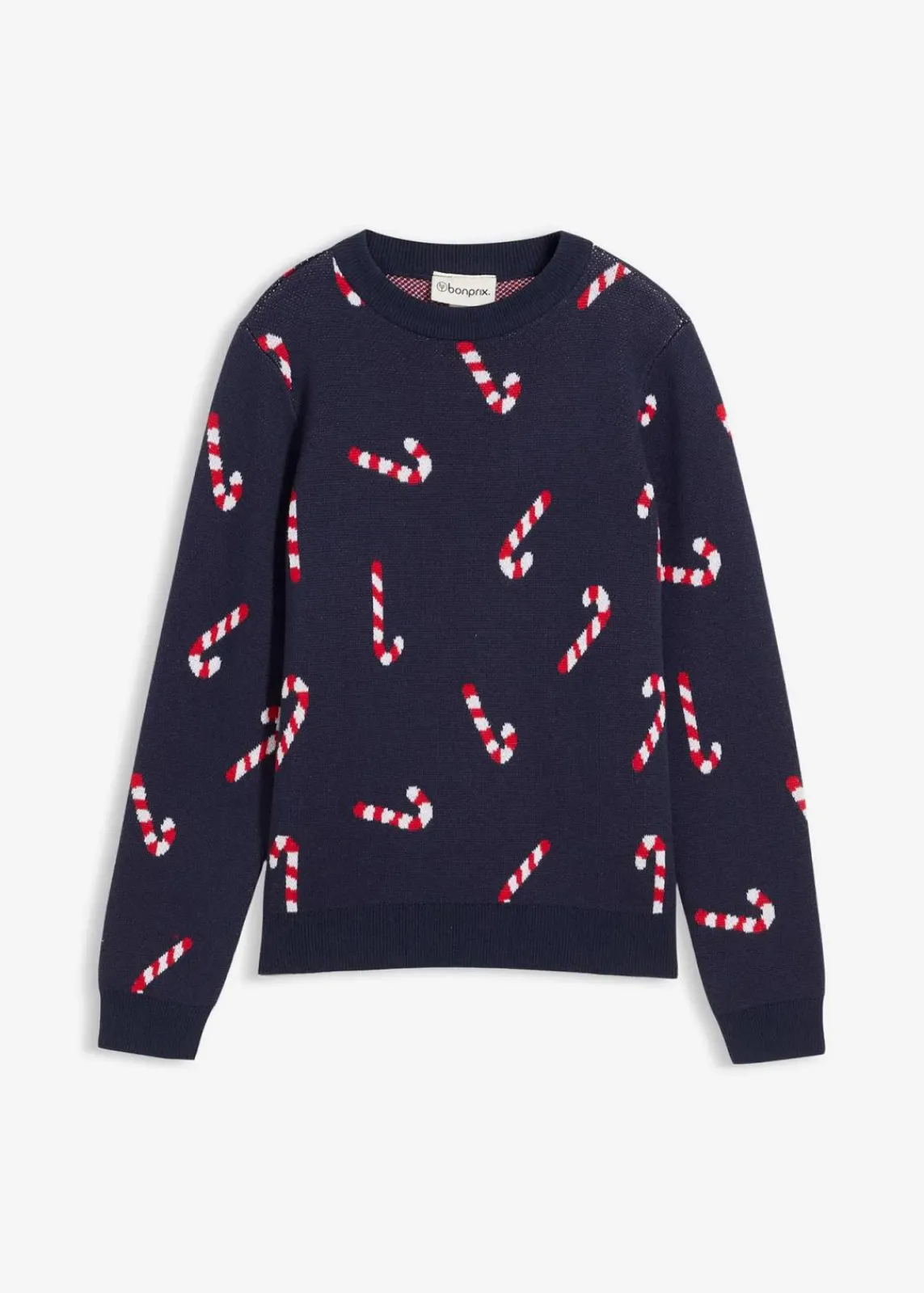 Dieser bezaubernde Weihnachtspullover bringt festliche Stimmung in die kalte Jahreszeit! Mit einem hohen runden Halsausschnitt und langen, eingesetzten Ärmeln bietet er eine bequeme Passform, die bis zur Hüfte reicht.Der Pullover ist mit einem Allover-Jacquard-Muster verziert, das fröhliche Zuckerstangen zeigt, und sorgt für einen echten Hingucker. Die Rippabschlüsse an den Ärmeln und am Saum runden das Design ab. Ideal für Weihnachtsfeiern oder gemütliche Feiertage – einfach anziehen und genießen!