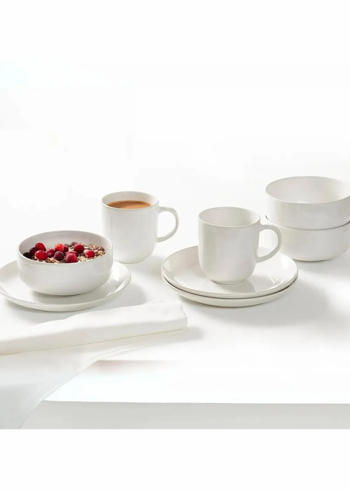 Das Frühstücksset überzeugt mit einer attraktiven Formensprache, die klassische und moderne Stilelemente in einer weichen, organischen Linienführung verbindet. Damit ist das Weißgeschirr ein zeitlos schlichter Begleiter, der sich angenehm ins Tischambiente integriert und Speisen jederzeit einen stilvollen Rahmen bietet. Bestehend aus: 4 Kaffeebecher (400 ml), 4 Teller (20,5 cm), 4 Schalen (14,5 cm)