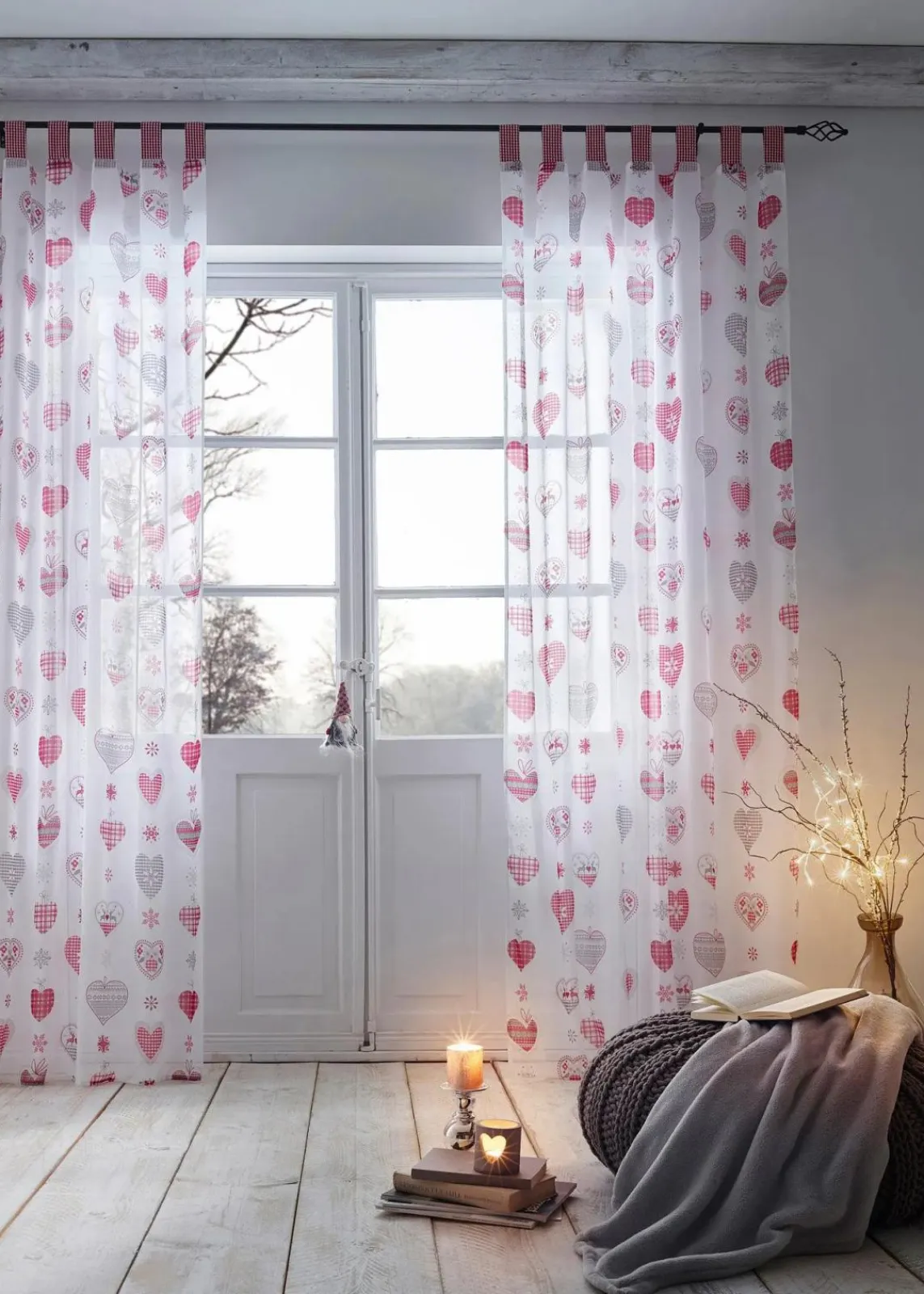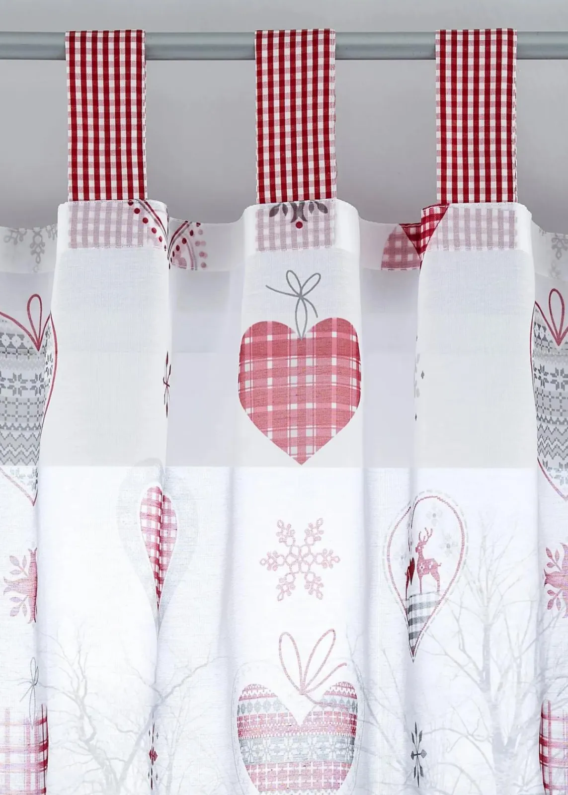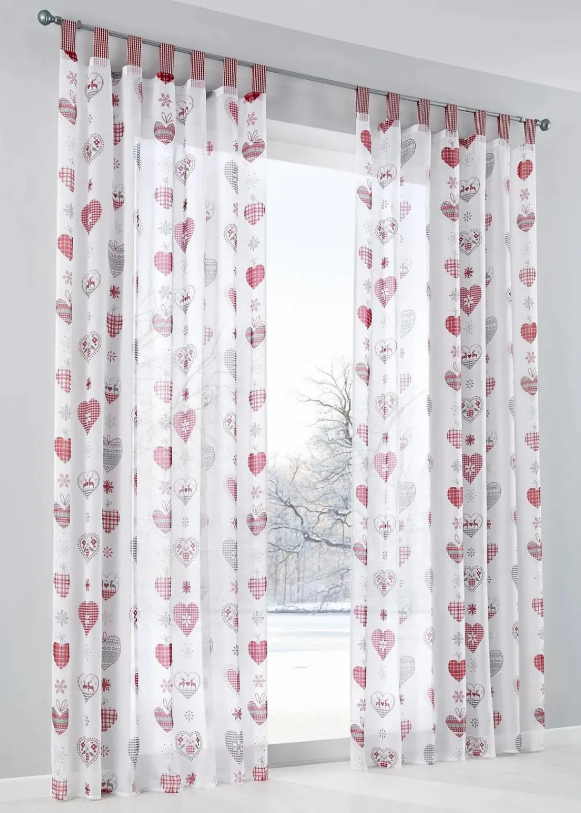 Die Gardine versprüht ein herzliches Ambiente. Sie überzeugt mit ihrem Herzendruck in rot/grau und der Transparenz aus leichter Voile-Stoffqualität. Farblich darauf abgestimmte Schlaufen runden das tolle Design ab.