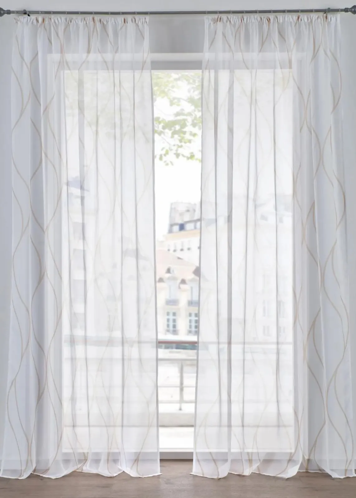 Hauchzartes Wohnaccessoire in moderner Ausführung! Die transparente Gardine ist in weiß mit einem modernem Druck in grau erhältlich und somit zu vielen Wohn-Stilen kombinierbar. Aus feinem Polyestermaterial gefertigt, präsentiert sich die lichtdurchlässige Gardine leicht fließend und pflegeleicht. Die Gardine besticht durch ihr innovatives Design und Ihre Leichtigkeit.