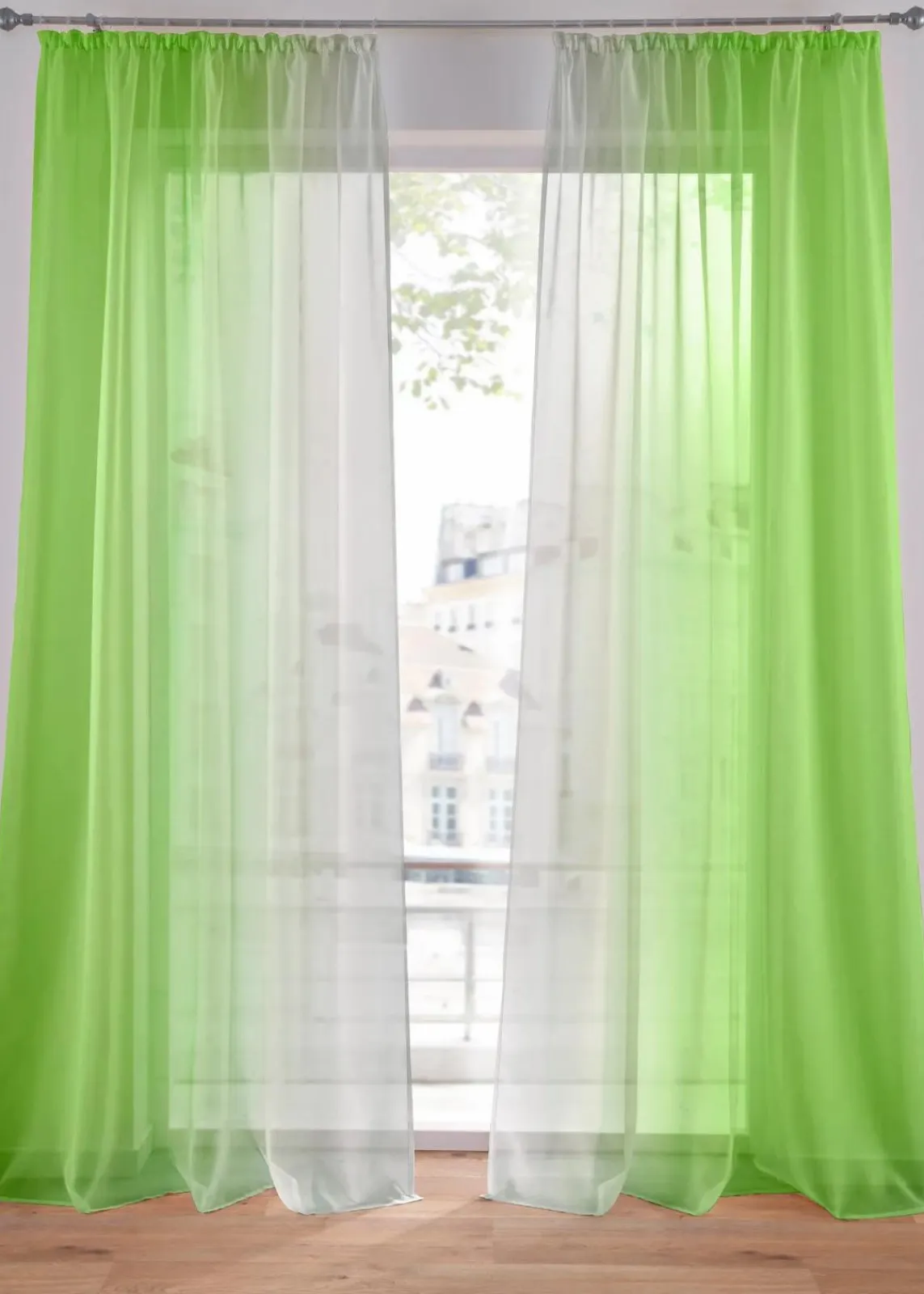 Ein toller Hingucker für deine Fenster: moderne Gardine mit einem frischen Farbenverlauf im praktischem 2er-Pack. Die Gardinen sind aus leichter transparenter Voile-Qualität und lassen dadurch viel Tageslicht rein.