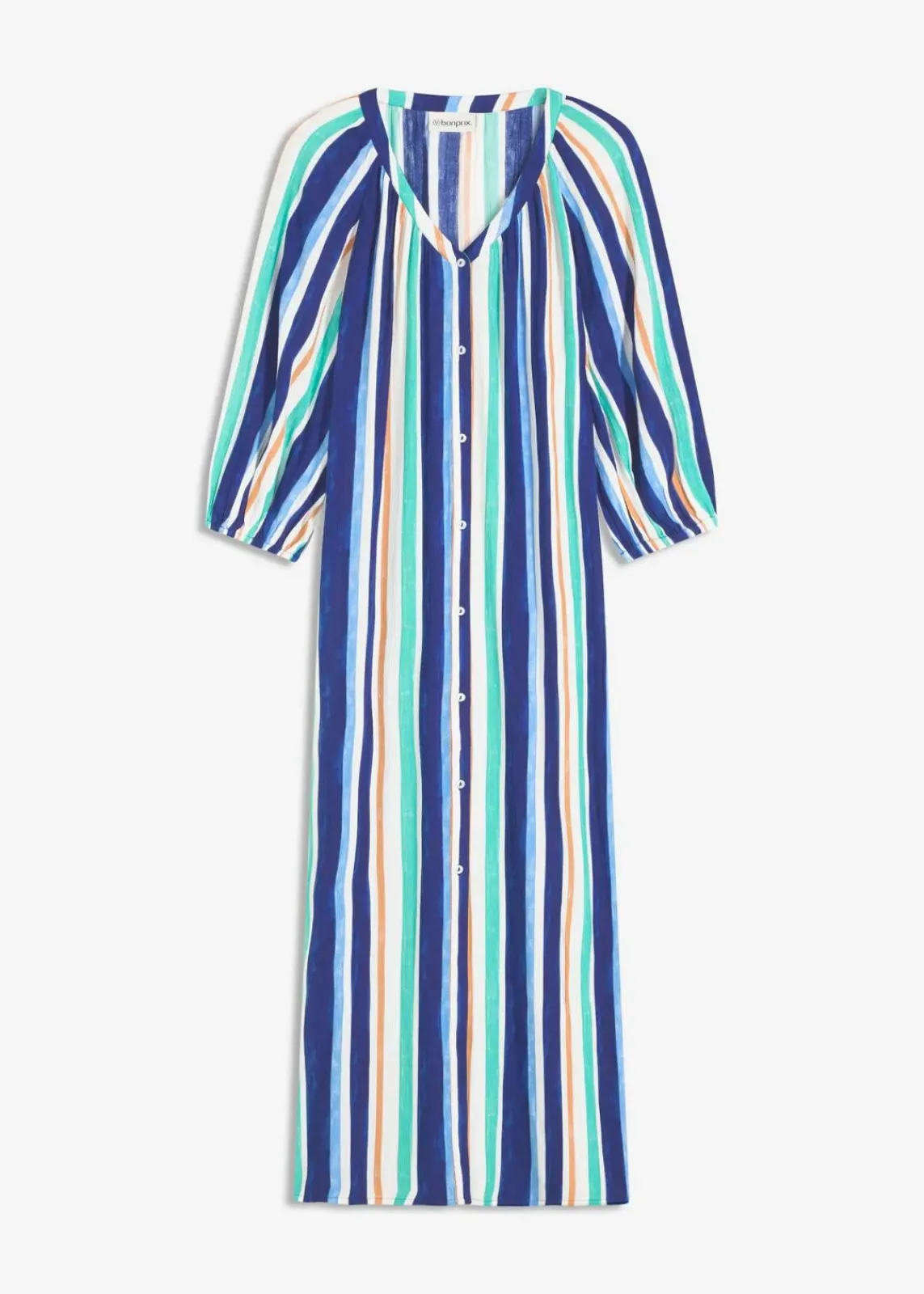 gestreiftes Kaftan-Kleid aus strukturierter Viskose mit Knopfleiste vorne und Seiten-Schlitzen