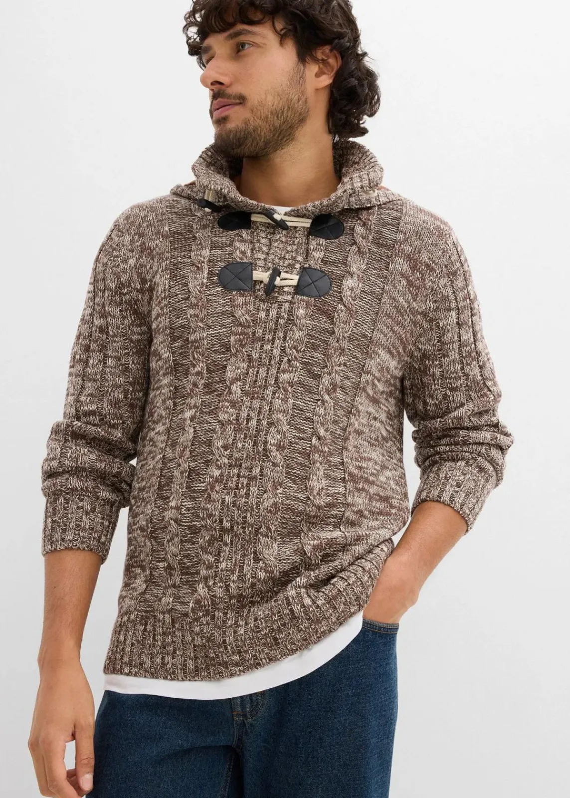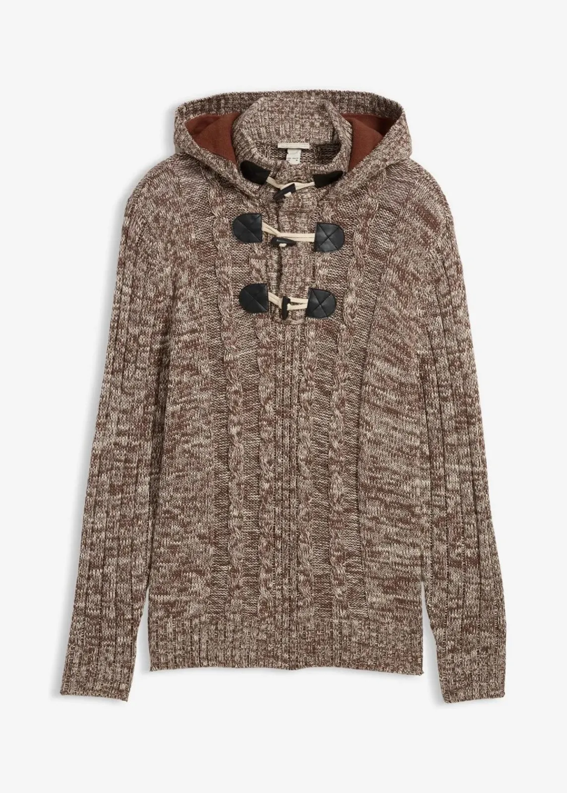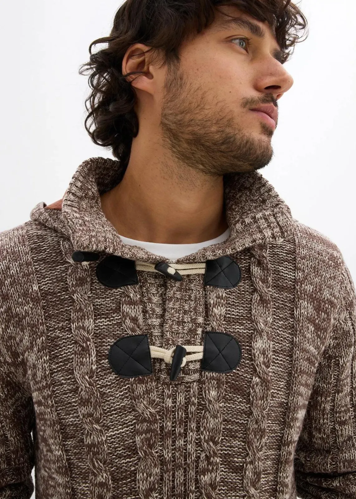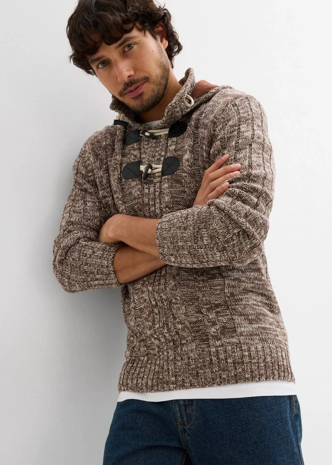 Cooler Kapuzen-Pullover aus Grobstrick mit Stehkragen und Knebelknöpfen