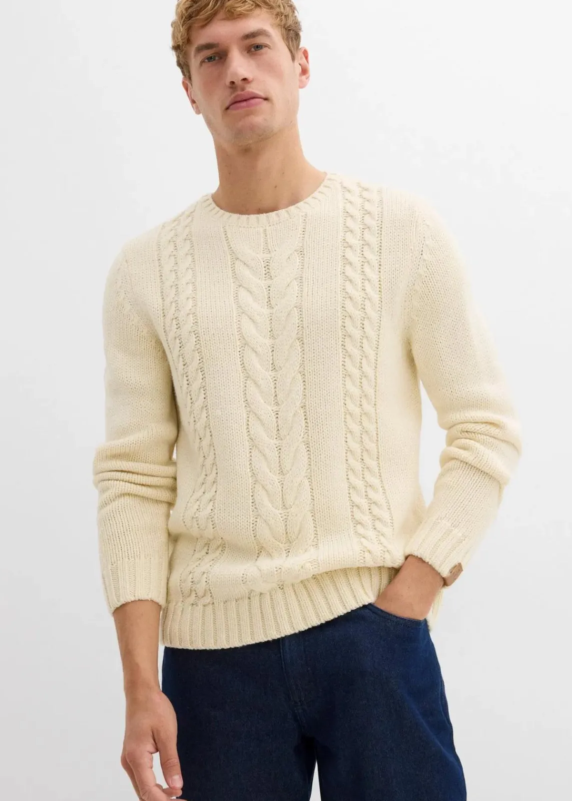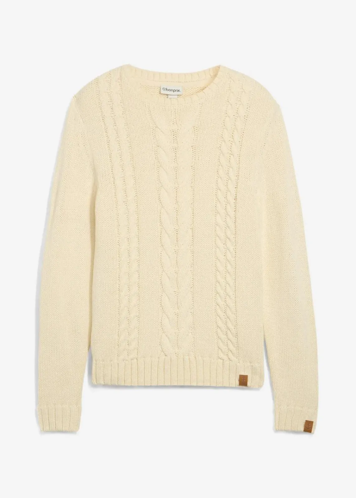 Schöner Pullover mit Zopfmuster, mit Rundhalsausschnitt und Lederimitat-Details