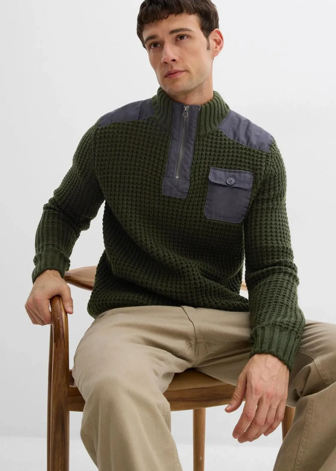 Dieser komfortable Herren Pullover aus der aktuellen Kollektion von John Baner ist ein echter Allrounder für die Freizeit. Der legere Pulli aus grobem Strick hat einen Stehkragen mit Zipper und lange Ärmel. Eine aufgesetzte Brusttasche sowie Stoff-Applikationen auf den Schultern unterstreichen den modischen Look des Pullovers.Er lässt sich vielseitig zu Jeans und Chinos kombinieren.