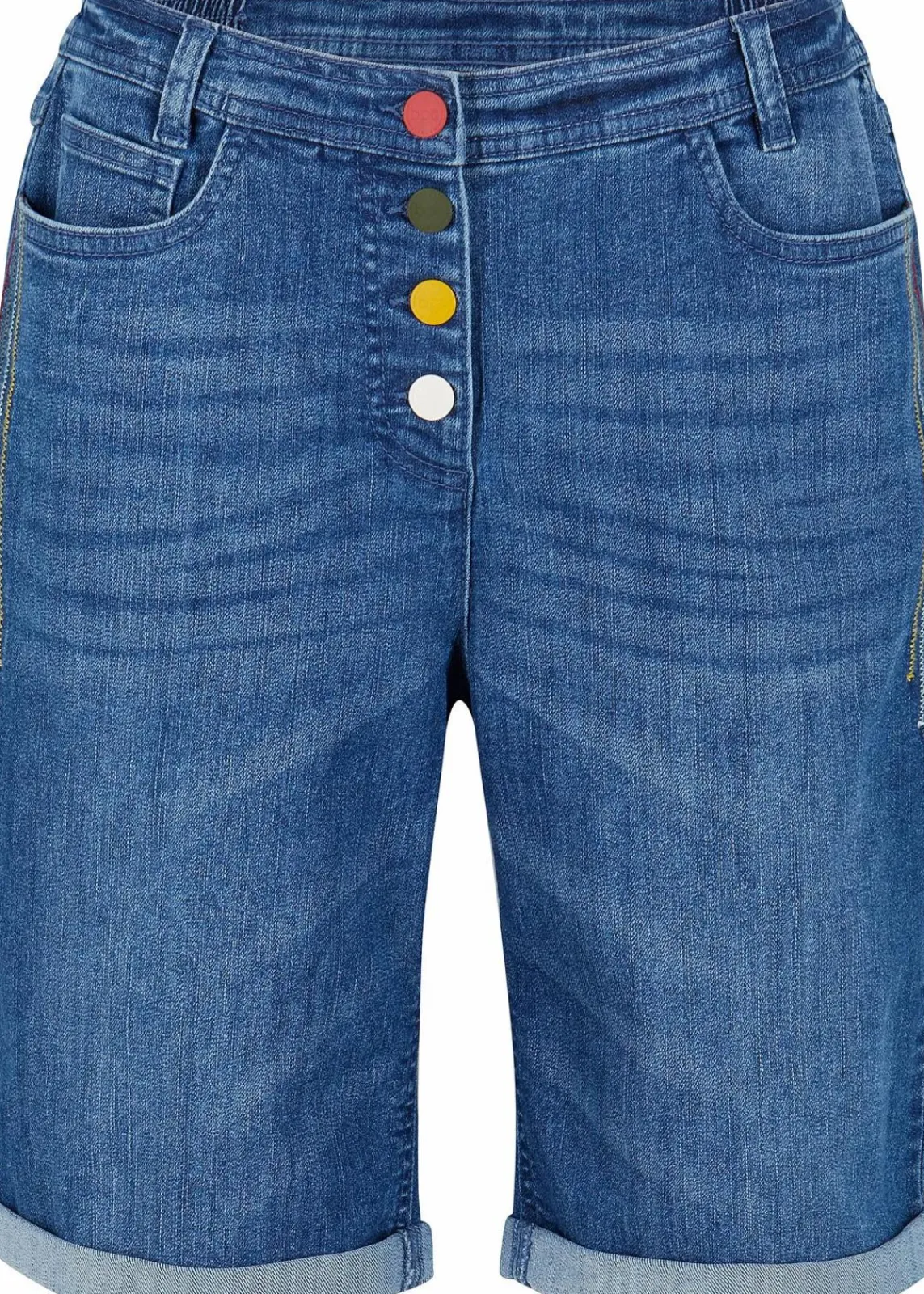 Stretch Jeans-Bermuda mit Stickerei und auffälliger Knopfleiste am Bund