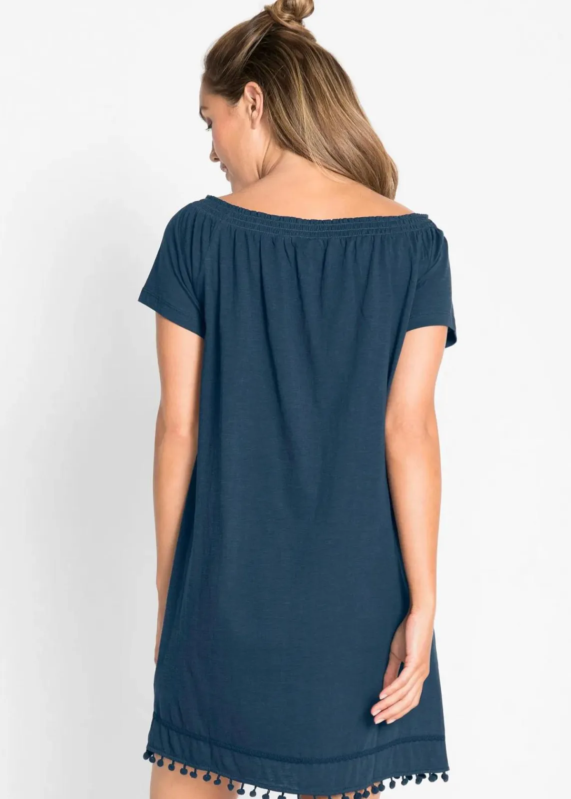 Baummwollkleid mit dezentem Carmenausschnitt und dekorativem Saum