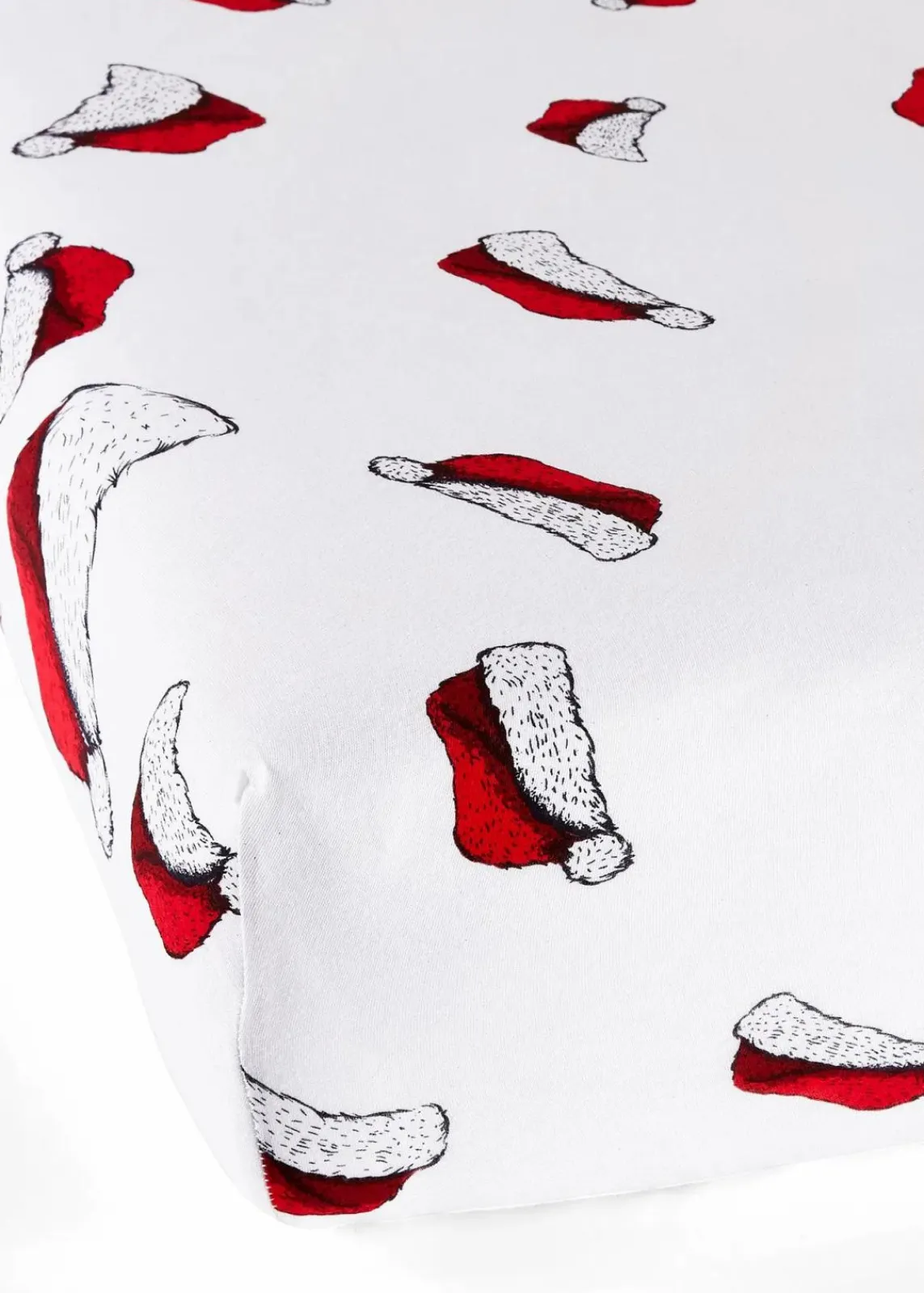 Pflegeleichte Jersey Qualitätslaken mit bedruckten Weihnachtsmützen.