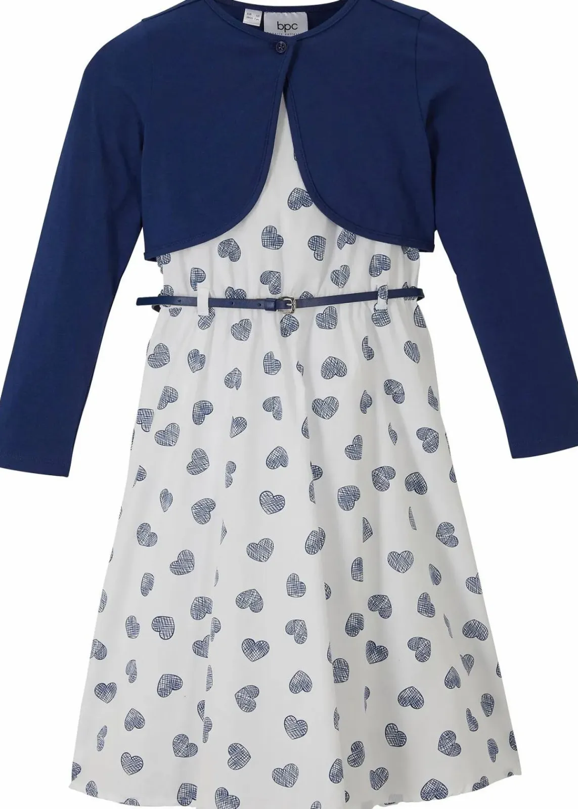 Dieses schöne Set besteht aus Kleid, Bolero und Gürtel. Der süße Herzchen-Print auf dem Kleid macht dieses Set besonders.
