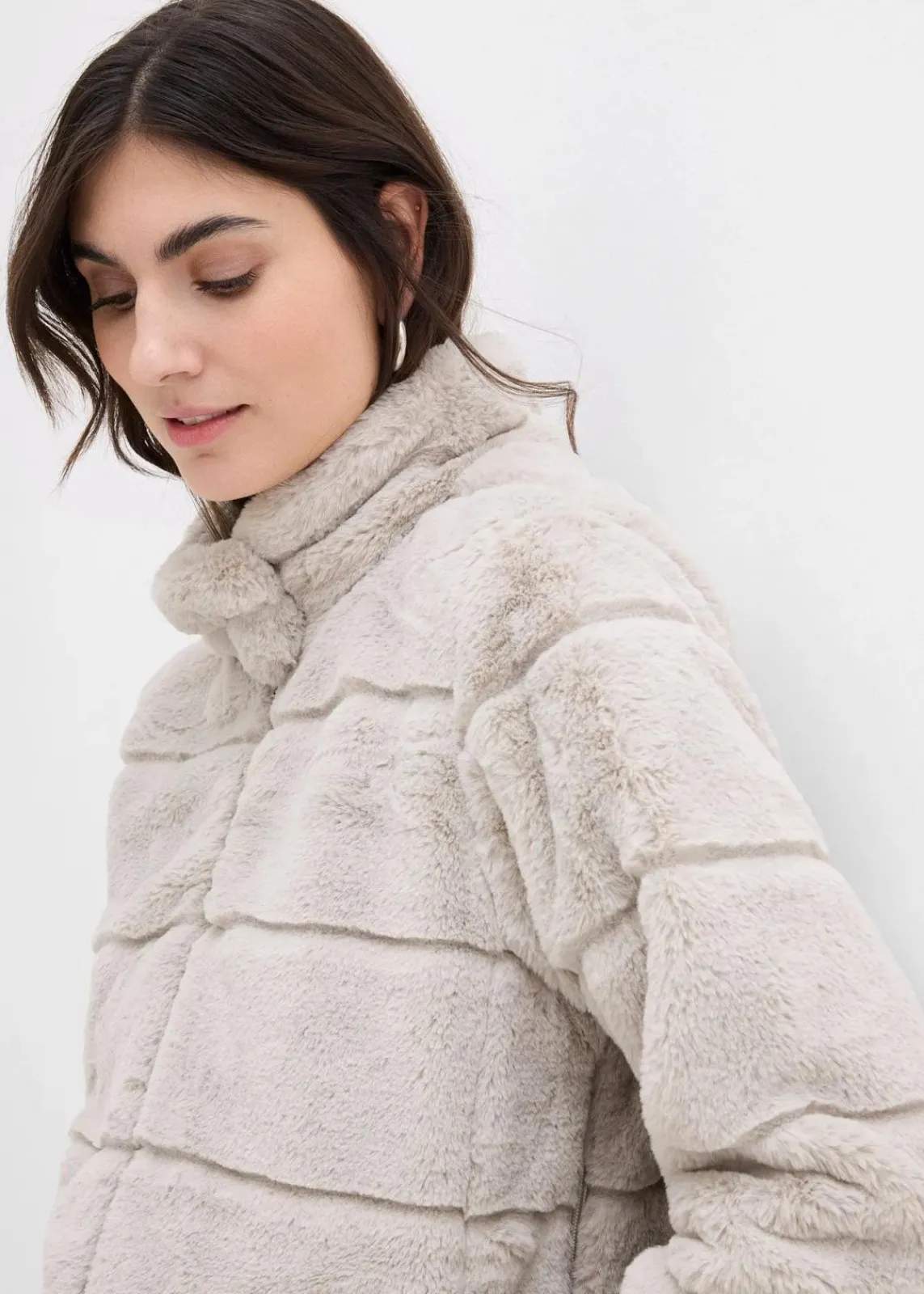 Jacke aus Fellimitat mit durchgehendem Reißverschluss. Seitliche Reißverschlüsse ermöglichen eine flexible Weitenregulierung, sodass die Jacke sowohl während der Schwangerschaft als auch danach getragen werden kann. Hinweis: Das Material kann leicht fusseln. Um dies zu minimieren, empfehlen wir, die Jacke vor dem ersten Tragen im Schonwaschgang zu waschen oder mit einer Fusselbürste zu behandeln.