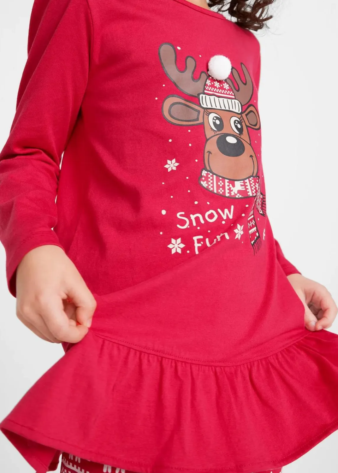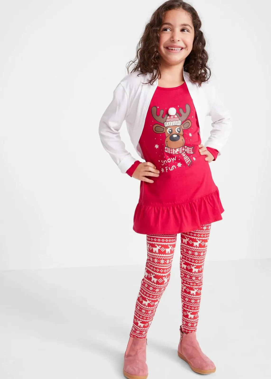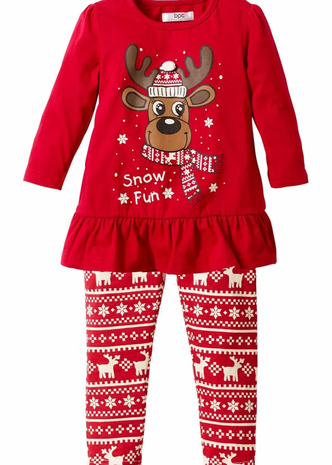 Weihnachtliches Shirt mit Elch-Motiv und Leggings für Mädchen. Langarmshirt mit Volant und Leggings mit tollem Allover-Print.