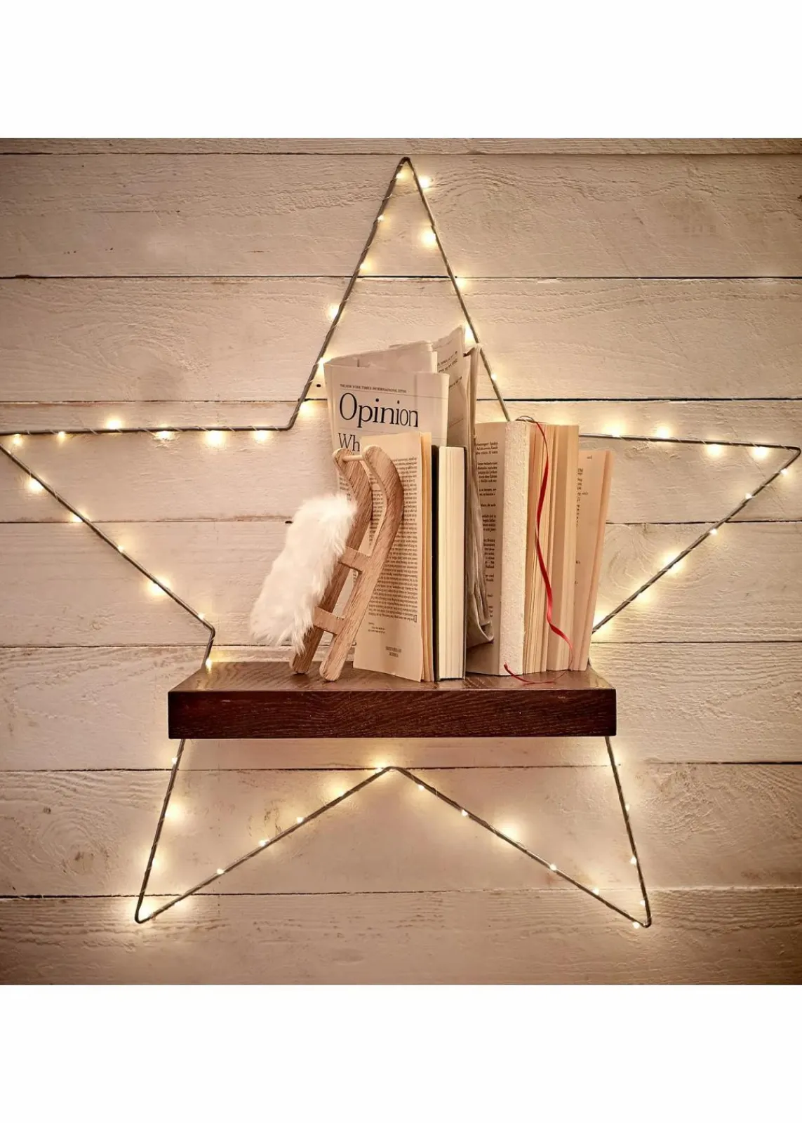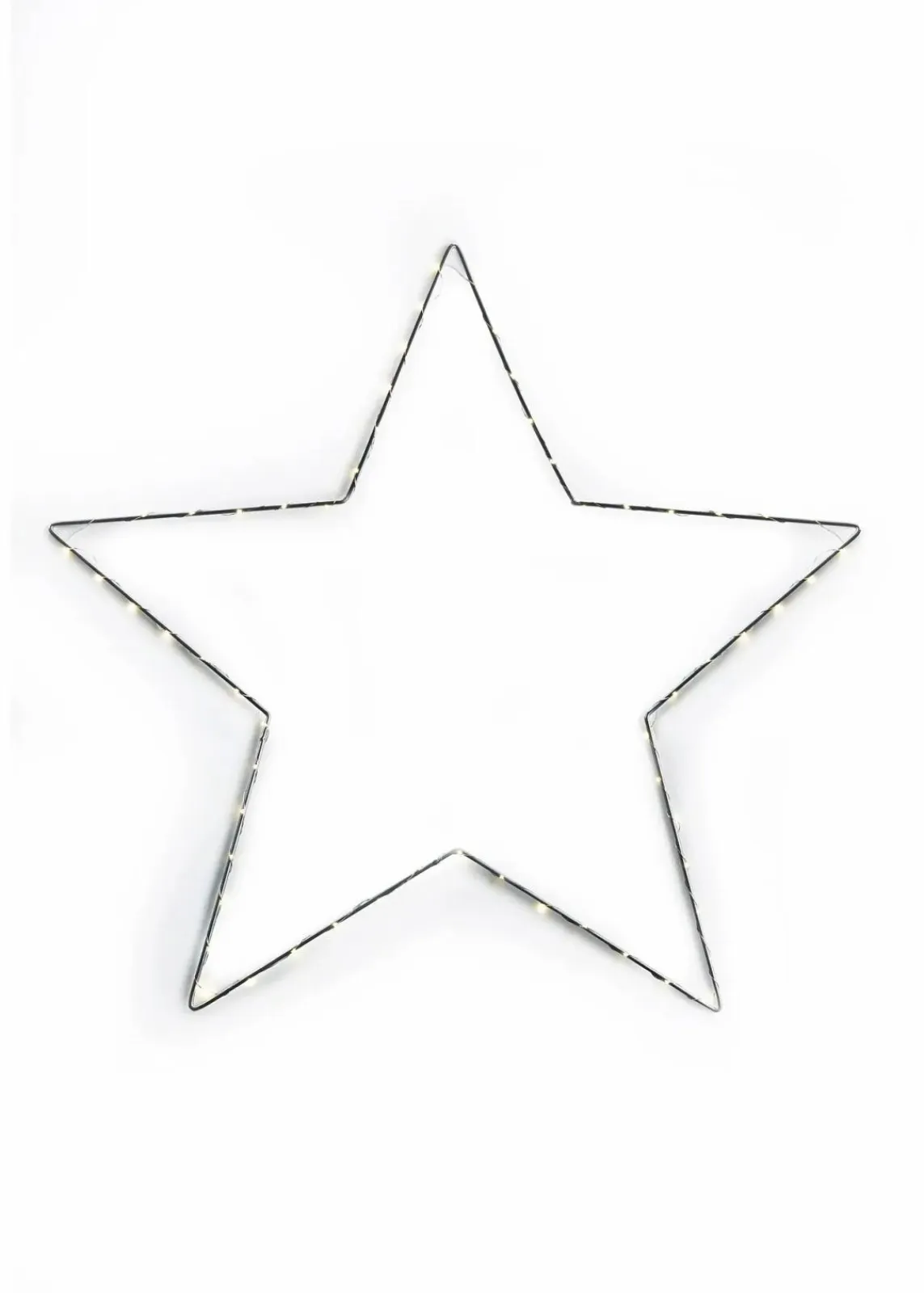 Dekorativer Leuchtstern zum Stellen und Hängen. Der Drahtstern in mit 60 warm-weißen LEDs umwickelt und gibt so ein schönes Licht an den Raum ab. Batteriebetrieben und somit überall dekorierbar. Zuleitung ca. 15cm. Nur für den Innenbereich. Ø80cm.