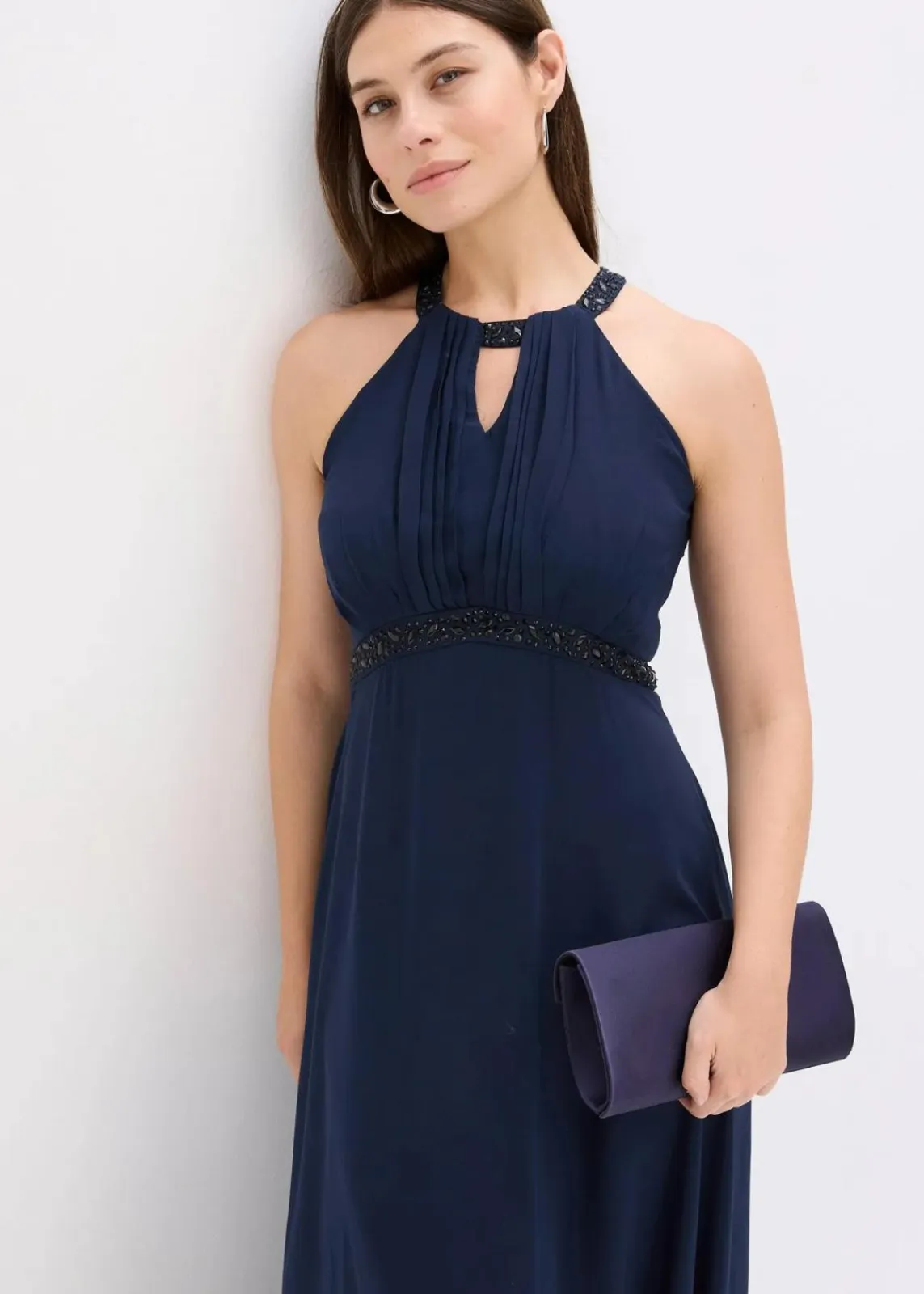 Modern und feminin: Abendkleid in Maxi-Länge mit Perlen-Applikation am Ausschnitt und Unterbrust-Einsatz.