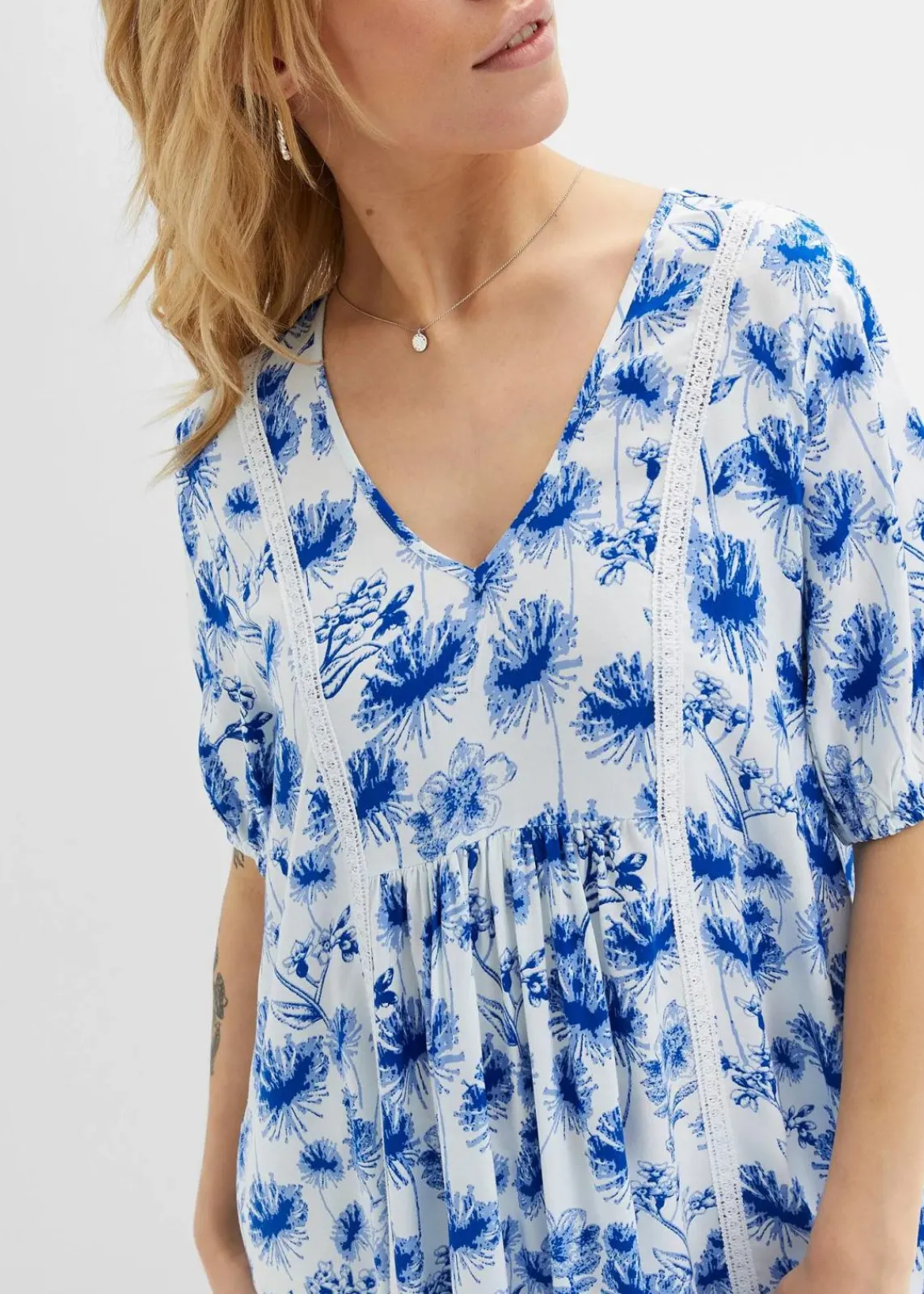 Figurumspielendes Tunika-Kleid mit Spitze und Ballonärmeln
