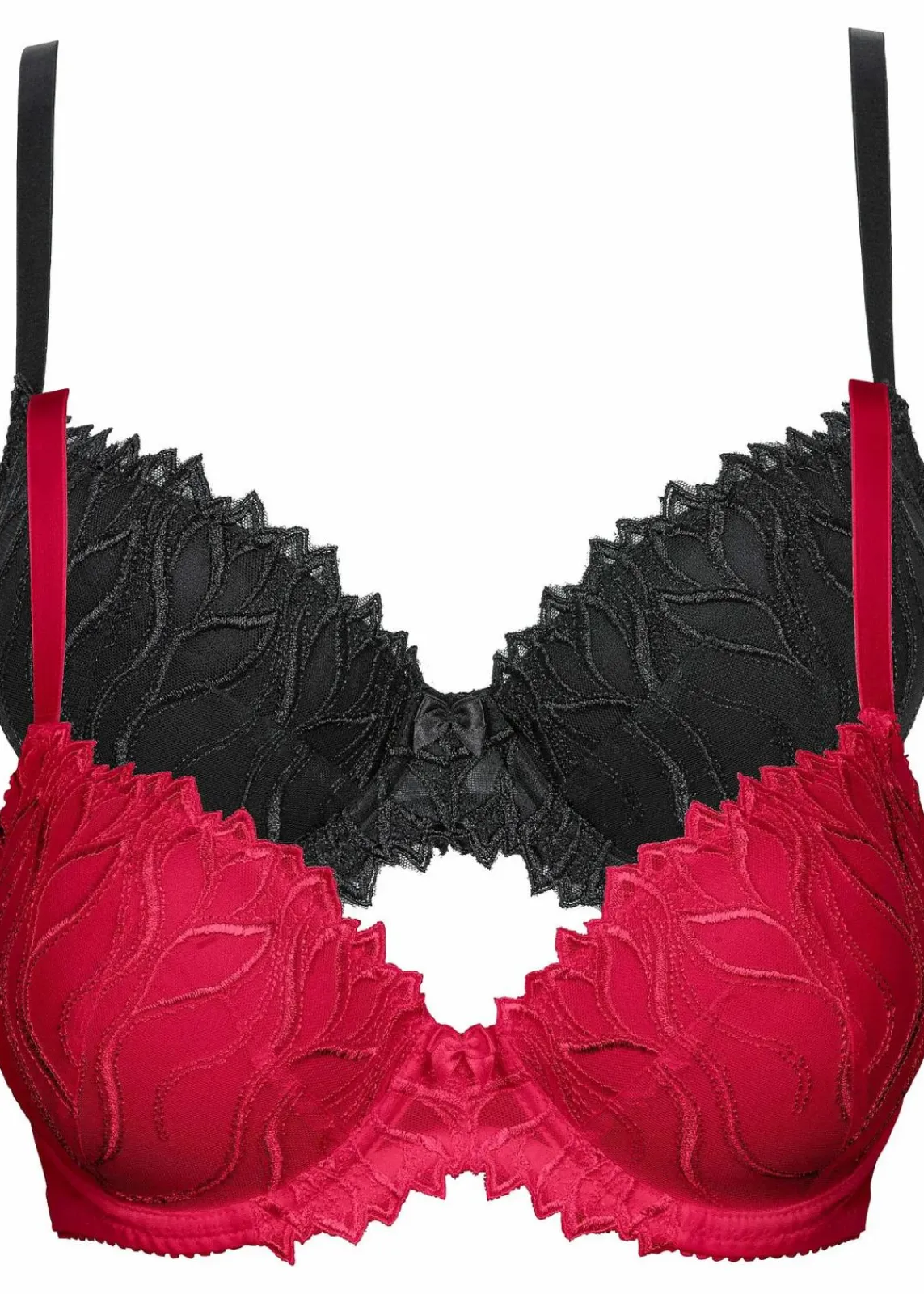 Dieser Doppelpack BHs von BODYFLIRT zeichnet sich durch ein romantisches Design aus. Die Cups und der Steg sind mit feiner Spitze mit gezackten Rändern verziert. Eine kleine Schleifenapplikation setzt einen schönen Akzent an der Brücke.Die unifarbenen BHs überzeugen mit vorgeformten Bügel-Cups. Eine integrierte Polsterung hebt den Busen an und zaubert ein optisch vergrößertes Dekolleté. In großen Größen sind Verschluss sowie Träger breiter gestaltet.