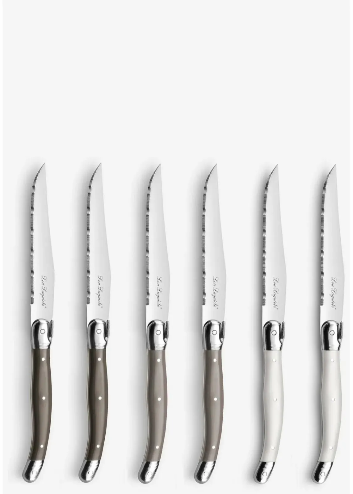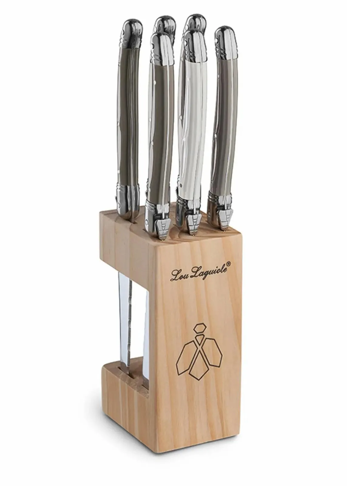 Rustikales Steakmesser-Set mit französischem Charme. Formschöne, farbige Griffe mit traditionellen Nieten und Edelstahlkronen. Für authentisch-traditionelles Landhaus-Feeling. Qualität made in France. Besonders scharfe, mikroverzahnte Messerklinge. Bestehend aus 6 Steakmesser und 1 Messerblock.