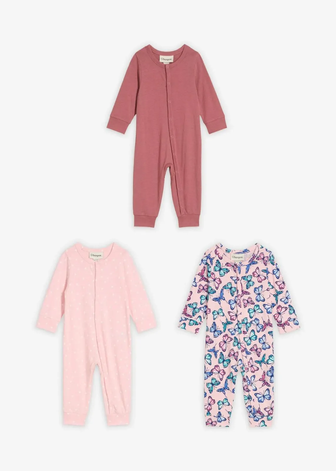 3er-Pack Overalls aus weicher Bio-Baumwolle mit Druckknöpfen für einfaches An- und Ausziehen. Rippbündchen an den Ärmeln sorgen für einen sicheren Sitz. Hautfreundlich und alltagstauglich.