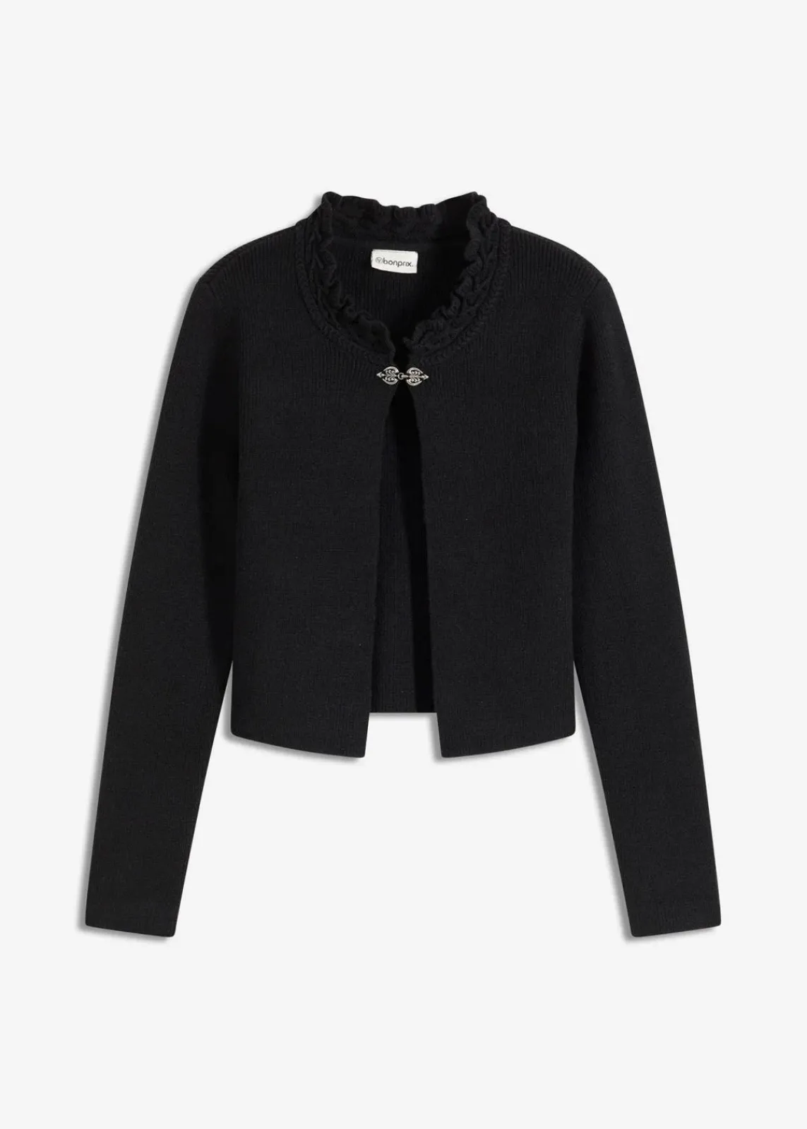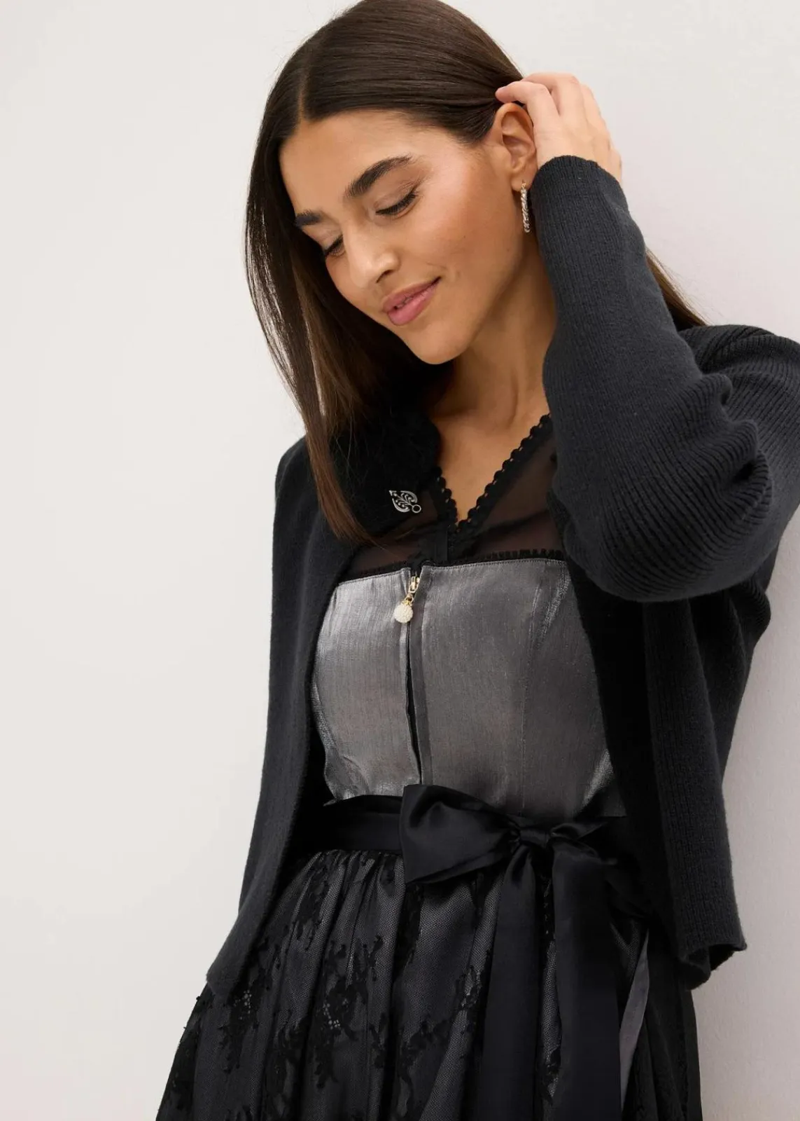 Modern und Feminin: Trachten-Stickjacke mit Zopfmuster am Ausschnit und dekorativem Verschluss