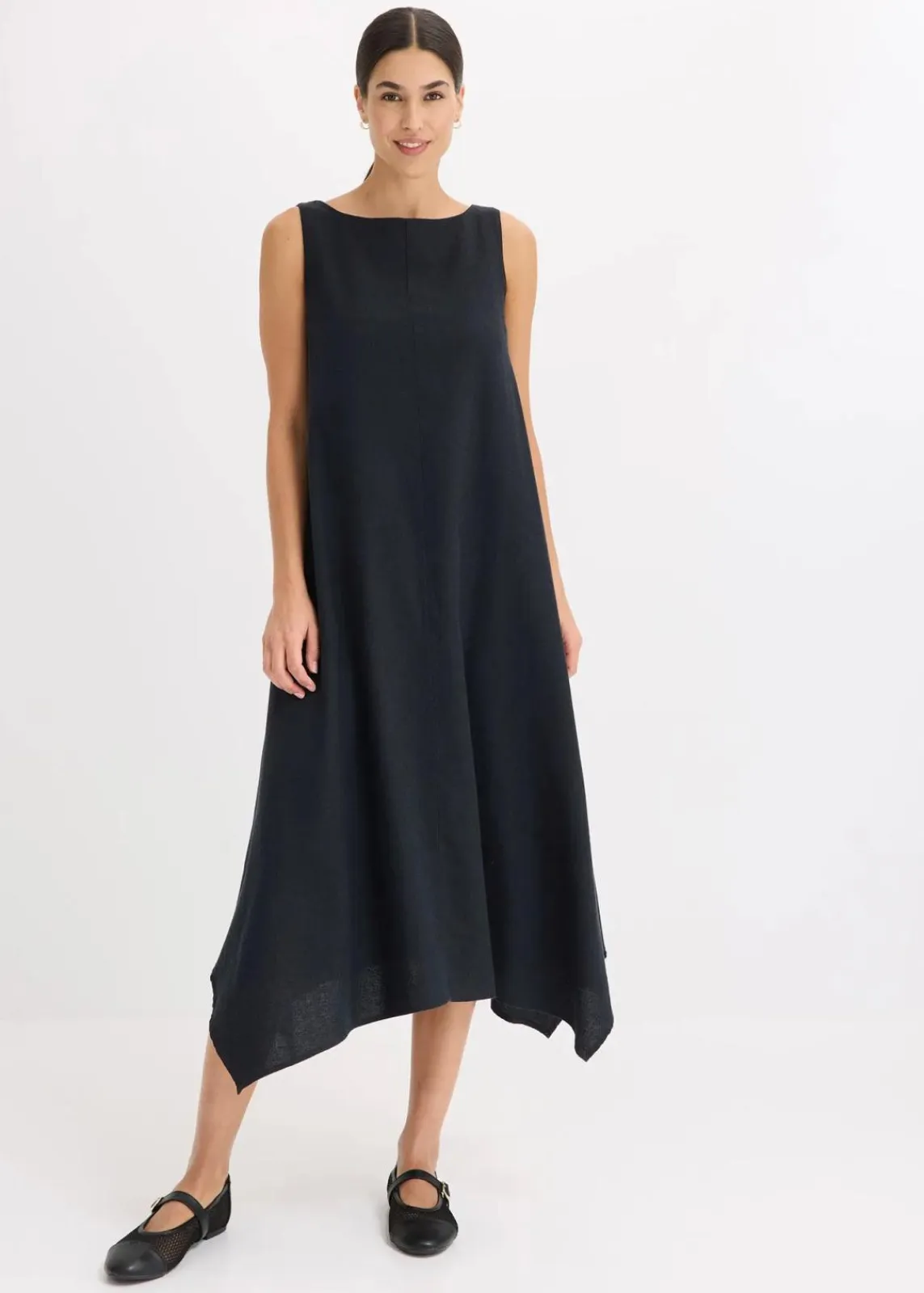 Langes ausgestelltes Kleid mit asymmetrischem Saum und seitlichen Taschen