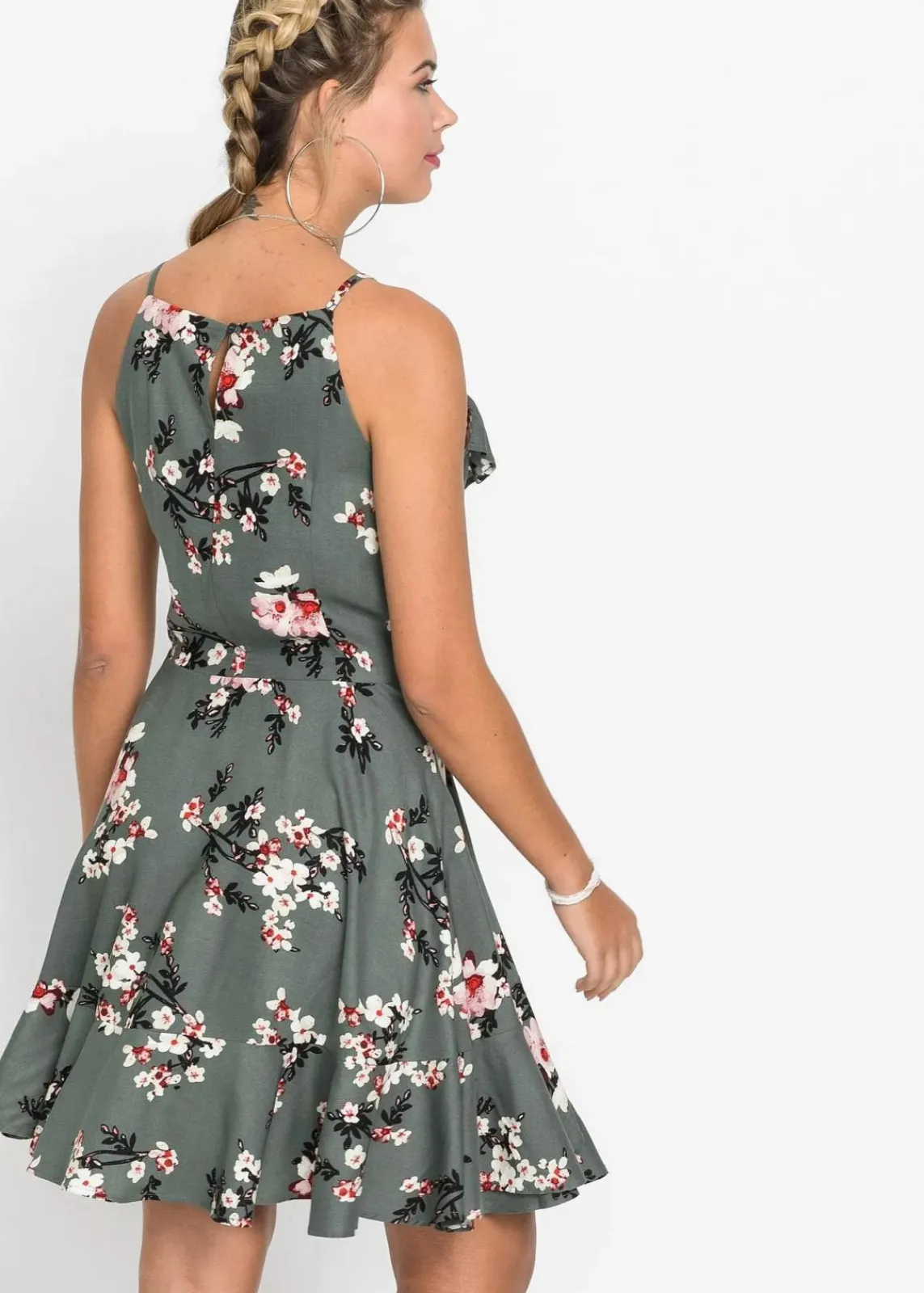 Sehr luftig und mit cooler Raffinesse präsentiert sich dieses trendige Kleid mit Volants auf der Vorderseite. Der auffällige Blumenprint und der tiefe V-Ausschnitt setzen das ärmellose Modell effektiv in Szene. Sehr dekorativ wirken die schmalen Träger, wie auch der weit schwingende Rockteil. Die kurze, taillierte Schnittform betont prima die Figur.