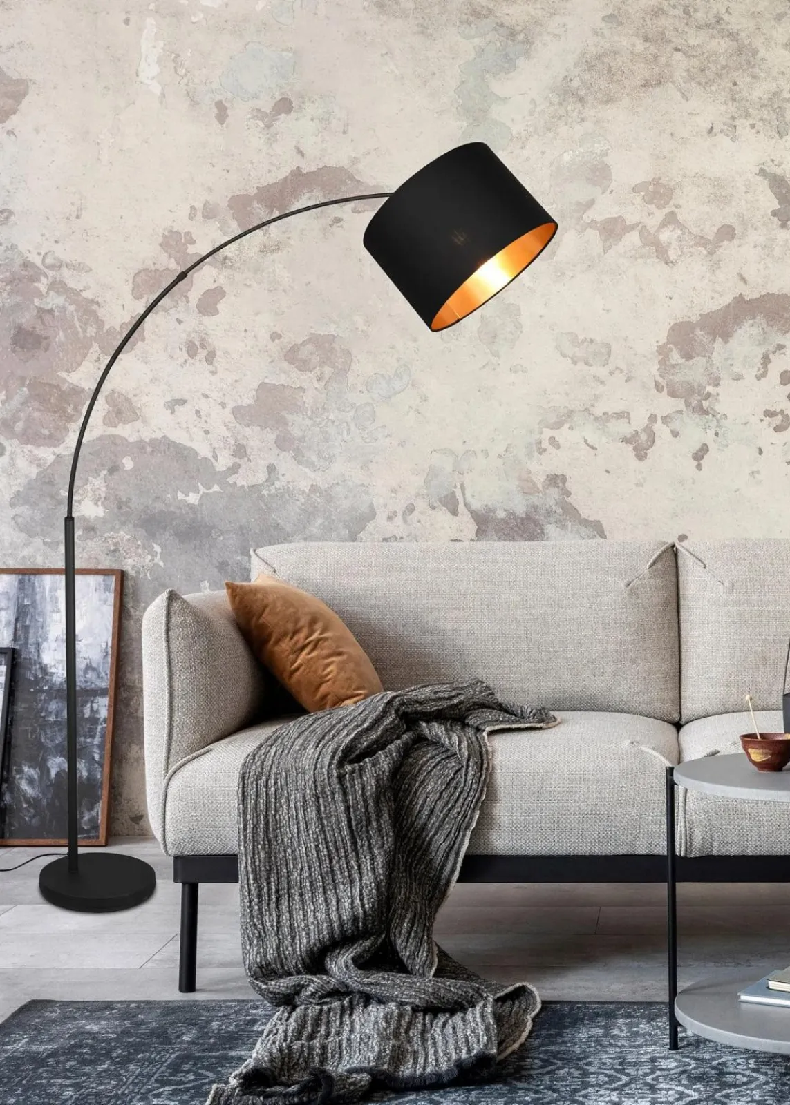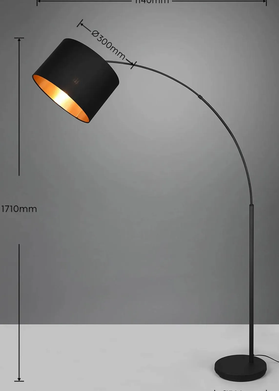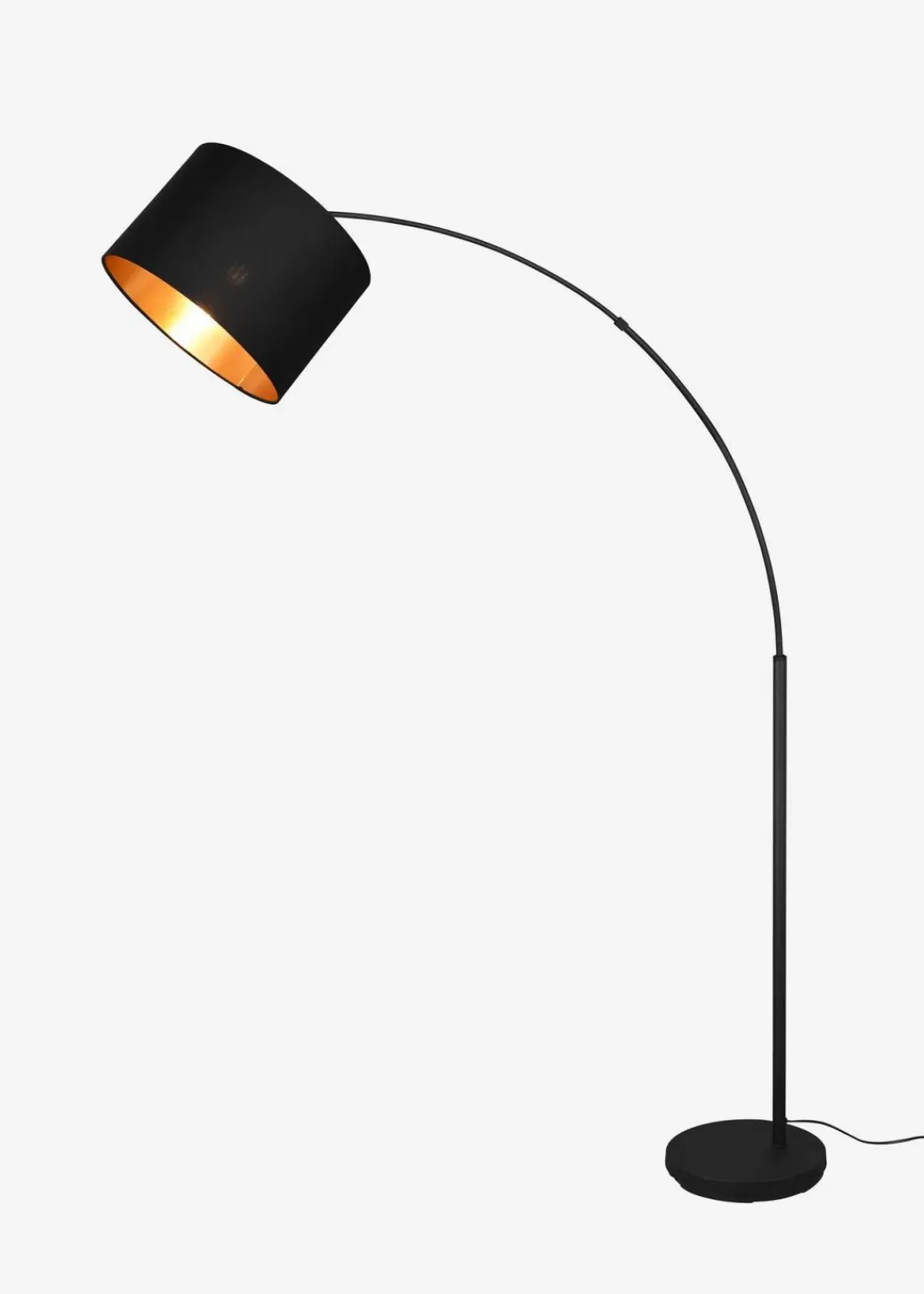 Diese Bogenleuchte schafft durch die Kombination von Form und Material eine Atmosphäre von Gemütlichkeit und Wohlbefinden im Wohnbereich. Die moderne und elegante Leuchte wird mit ihrem Textilschirm zum Highlight neben Ihrem Sofa und sorgt zeitgleich für eine perfekte und stimmungsvolle Beleuchtung. Über einen Fußschalter lässt sich die Stehleuchte bequem ein- und ausschalten. ‚Die Farbkombination nach dem Motto “Black meets Gold“ wirkt elegant und edel und wird zu einem besonderen Blickfang mit toller Lichtwirkung.‘ Für eine energiesparende Beleuchtung empfiehlt sich die Verwendung eines LED Leuchtmittels. Diese sind eine optimale Alternative zu herkömmlichen Halogen Leuchtmitteln und stehen für eine hohe Lichtqualität und eine Energieeinsparung von bis zu 80%. Zusätzlich stehen LED Leuchtmittel für eine lange Lebensdauer, einer geringen Wärmeentwicklung und schonen gleichzeitig die Umwelt.