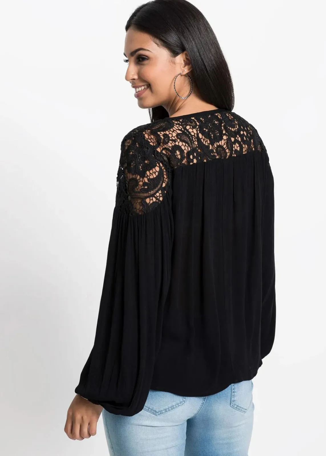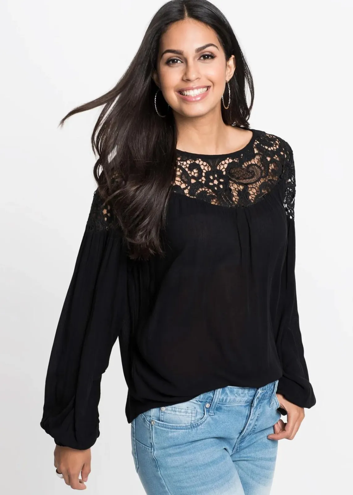 Ein transparenter Spitzeneinsatz im oberen Bereich verleiht dieser Tunika eine romantische Note. Der feine Faltenwurf entlang der Nähte unterstreicht den verspielten Charakter. An den hohen Rundhalsausschnitt schließt ein kurzes Bindeband an. Ein elastischer Bund und die modischen Ballonärmel runden die Tunika mit Spitze von BODYFLIRT ansprechend ab. Sie begleitet Skinny Jeans und Pumps ebenso gut wie einen Bleistiftrock aus Lederimitat.
