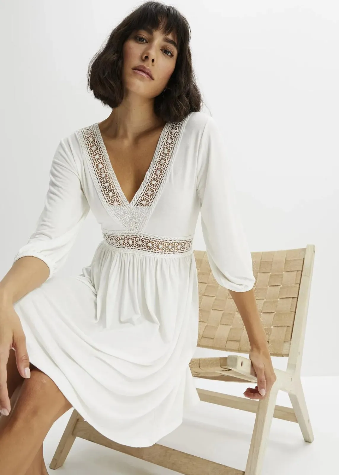 modisches Kleid mit dekorativer Spitze am Ausschnitt und vorne an der Taille.