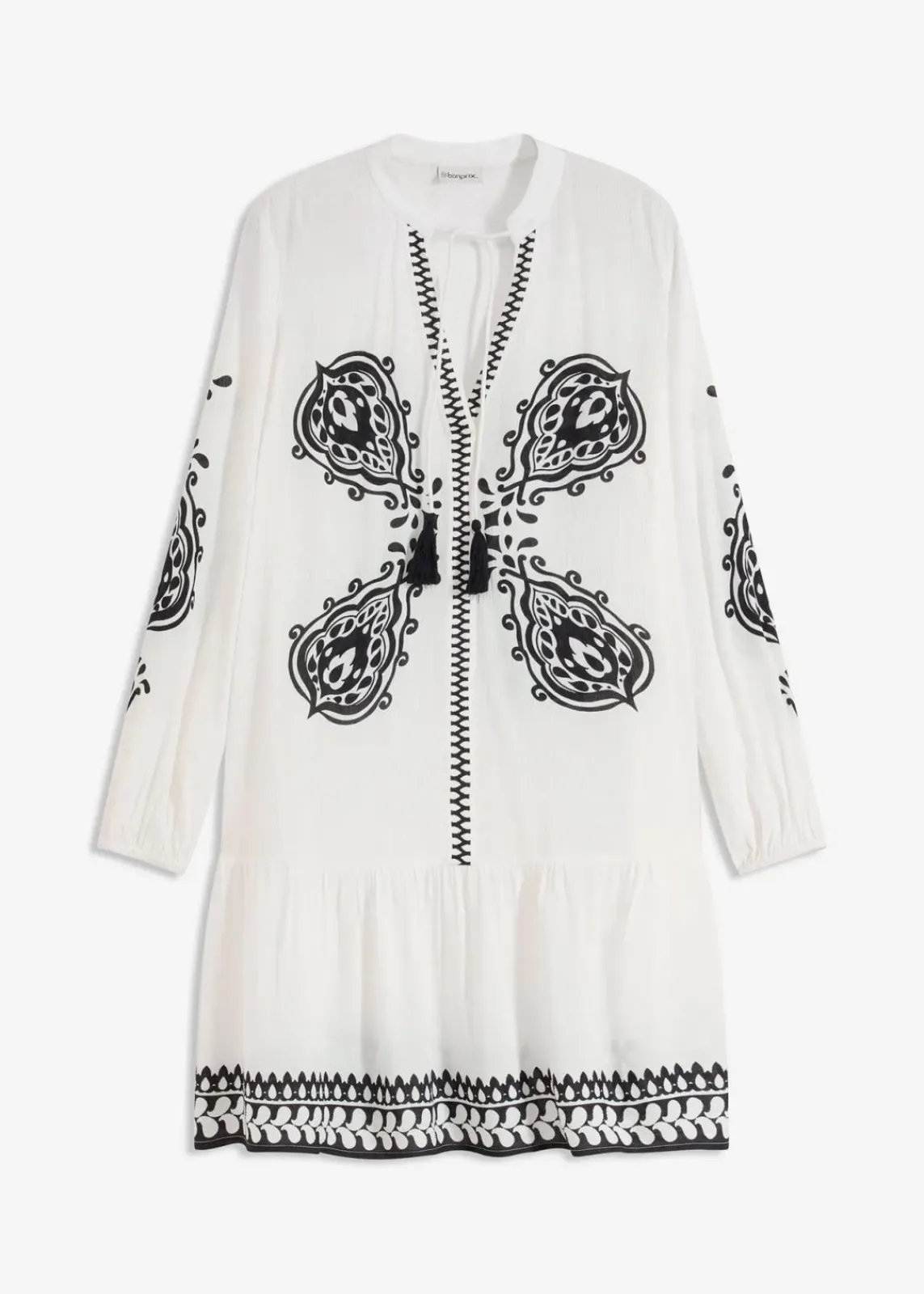 sommerliches Tunika-Kleid aus strukturierter Viskose mit Binde-Details vorne am Ausschnitt und angesetztem Volant am Rocksaum