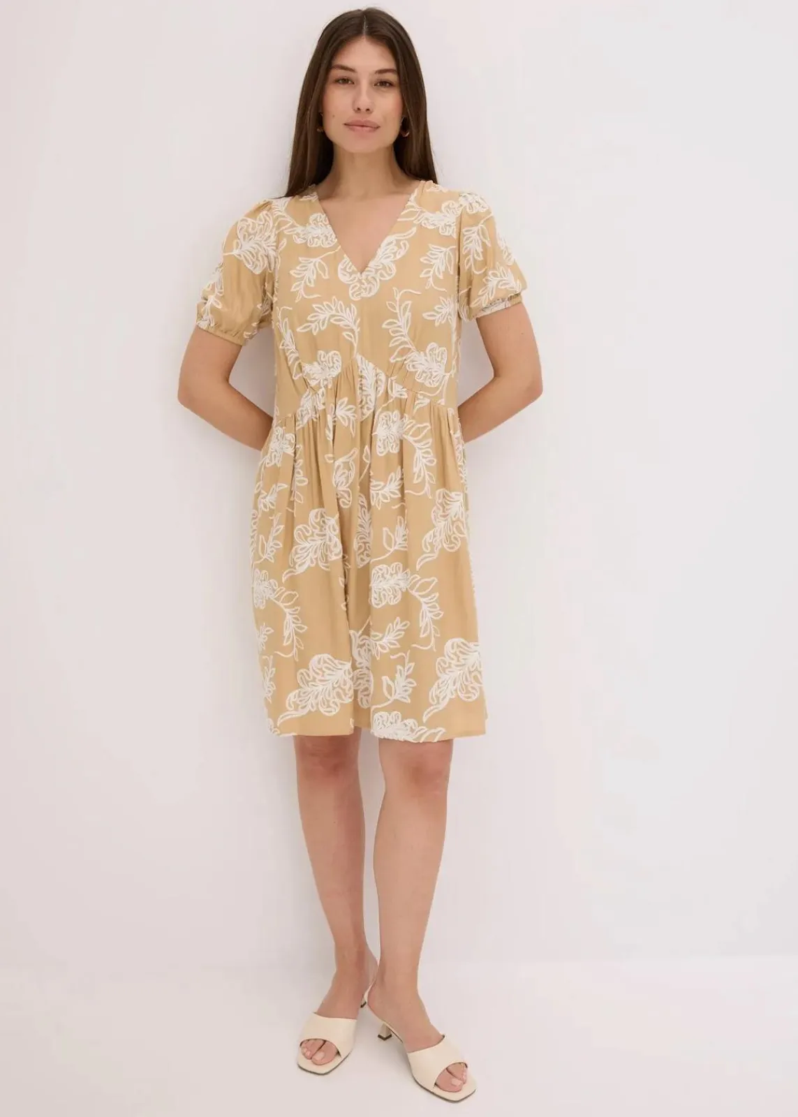 modisches Tunika-Kleid aus fließender Viskose mit dekorativer Stickerei und kleinen Puffärmeln
