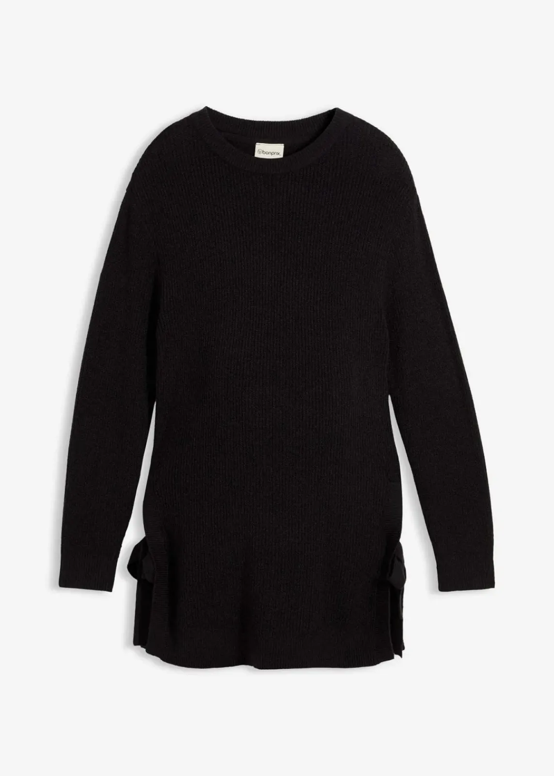 Flauschiger Umstandspullover mit praktischen Stillschlitzen und dekorativen Bändern. Dank seiner hüftbedeckenden Länge lässt er sich vielseitig kombinieren, zu Leggings, Hosen oder Jeans.