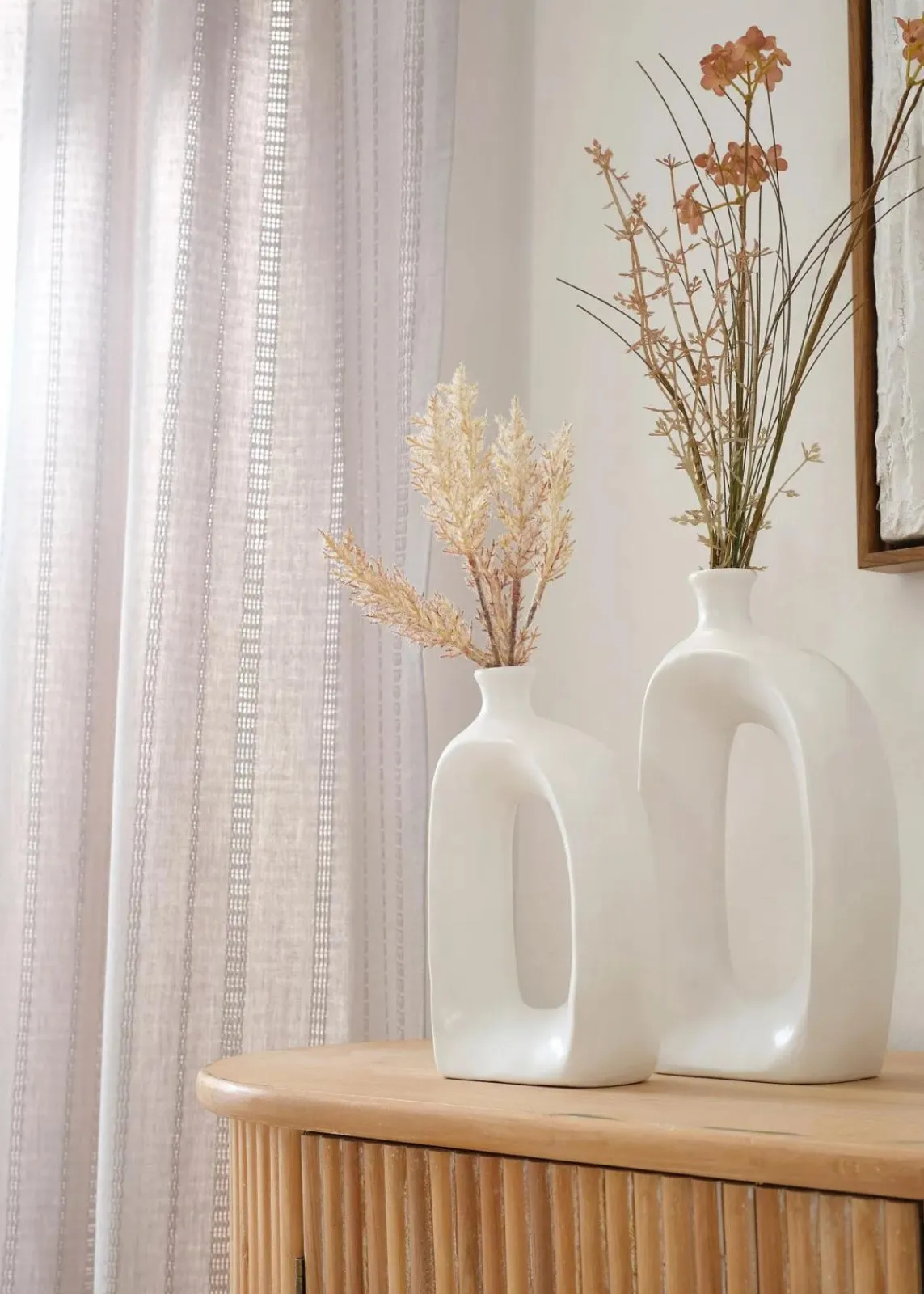 Diese außergewöhnlichen Vasen in strahlendem Weiß bestechen durch ihre moderne Form und den skulpturalen Charakter. Die offene Gestaltung und die klaren Linien machen sie zu einem besonderen Blickfang. Ob mit einzelnen Blumen, Trockenblumen oder ganz ohne Dekoration – diese Vasen sind ein stilvolles Statement und bringen eine moderne Note in jeden Raum.