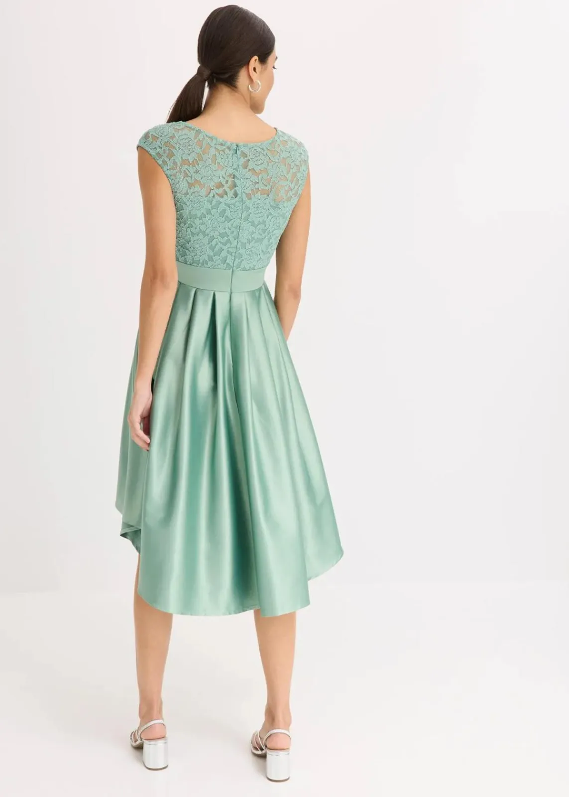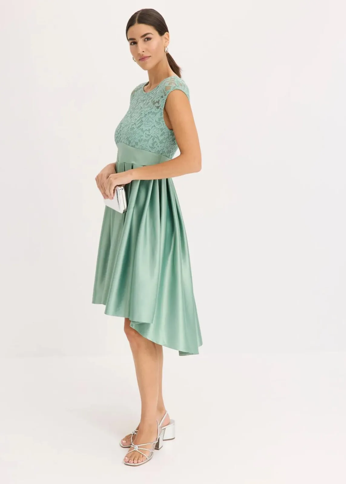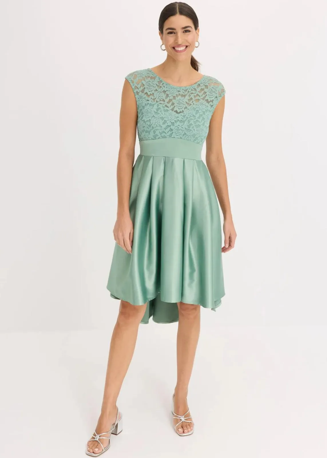 Bezauberndes Cocktail-Kleid aus glänzendem Satin mit Taillen-Einsatz und Spitze im Oberteil